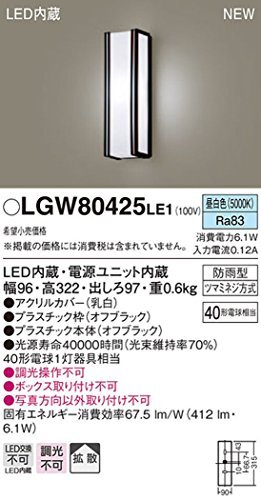 商品名 | パナソニック(Panasonic) LED ポーチライト 壁直付型 40形 昼白色 LGW80425LE1 | ||||||