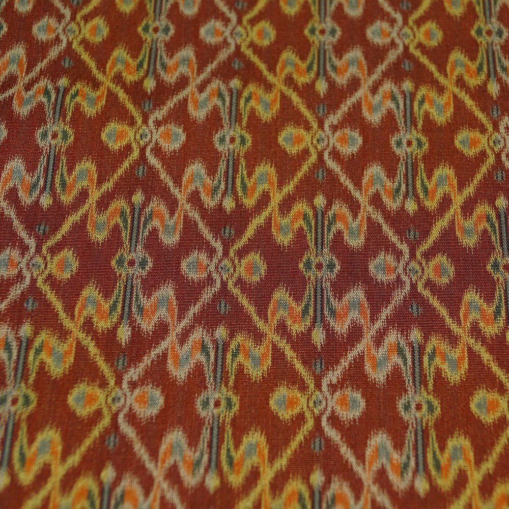 | 商品 説明 | しっとりとした海老茶色系の地に太子間道が織り込まれた開き名古屋帯(鏡仕立て・額縁仕立て)です。帯裏に龍村美術織物のタグが付いております。開き名古屋帯でお太鼓部は比翼仕立てです。(お太鼓部の端が二重になっており、ご着用時には袋帯の様に二重太鼓風に見えます。)前帯幅の調整ができる鏡仕立てとなっております。セミフォーマル向きの帯となります。色無地や江戸小紋、古典柄の小紋、付下げにお締めください。 【太子間道】 原品は、法隆寺の寺伝では聖徳太御使の裂とされていますが、何に使用されたものかは不明です。これはいわゆる間道(縞織物のこと)ではなく、経糸かすりで、時代に将来されたものです。 今日でも、南方のスマトラ・バリ島・スンバワの辺りで同系統のかすりが製織されており、まことに精緻な技巧を要するもので、現代のかすりよりもはるかに優れたものです。 原品のもつ、微妙で律動的な、しかも南方情緒のあふれるかすりの美的表象を、現代風に活かし、特殊な織法で製作されております。 |