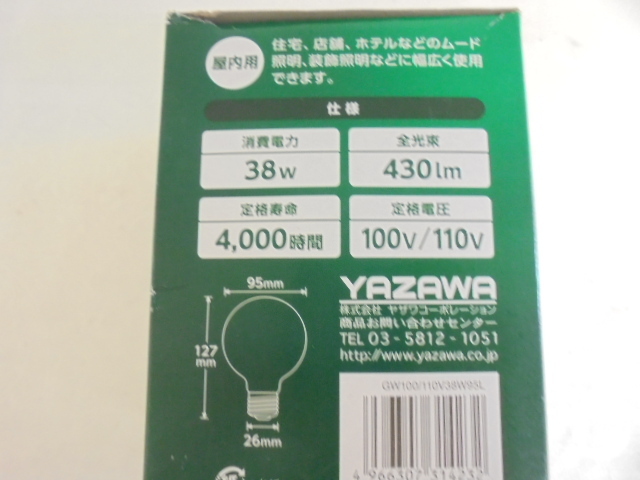【KCM】□JHKZ-95★新品・箱傷み★YAZAWA ボール電球 ホワイト 径95mm E26口金 40W形 1個入 調光器対応 GW100/110V38W95L