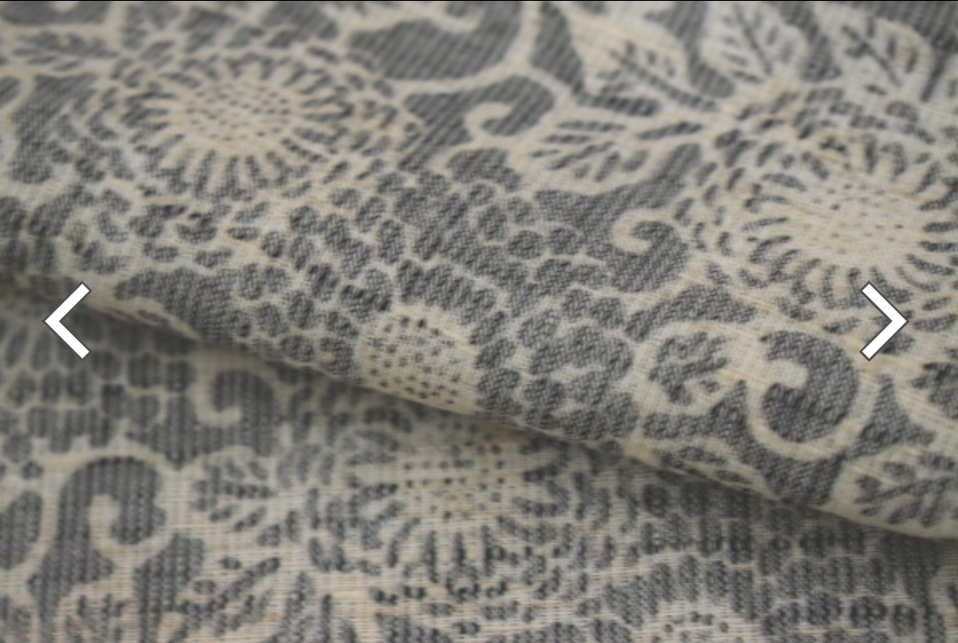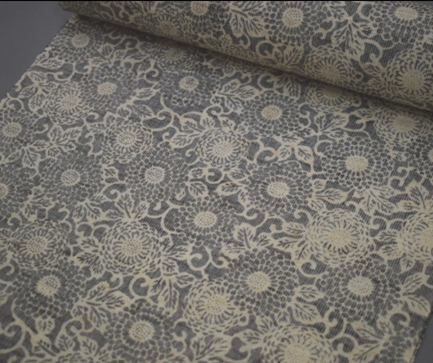 紬の変わり織り、薄グレーとオフホワイトの花から草