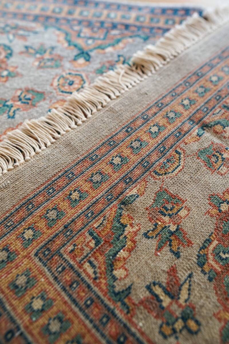 パキスタンの絨毯織りは、古くはペルシャや中央アジアの伝統を受け継ぎながらも、独自の発展を遂げてきました。特に20世紀以降、パキスタンは高品質の手織り絨毯の生産地として世界に知られるようになり、その特徴は細やかな織りと耐久性、そして伝統的な幾何学模様や花文様に見られます。この一枚にも、代々受け継がれてきた職人の技術と美意識が凝縮されています。