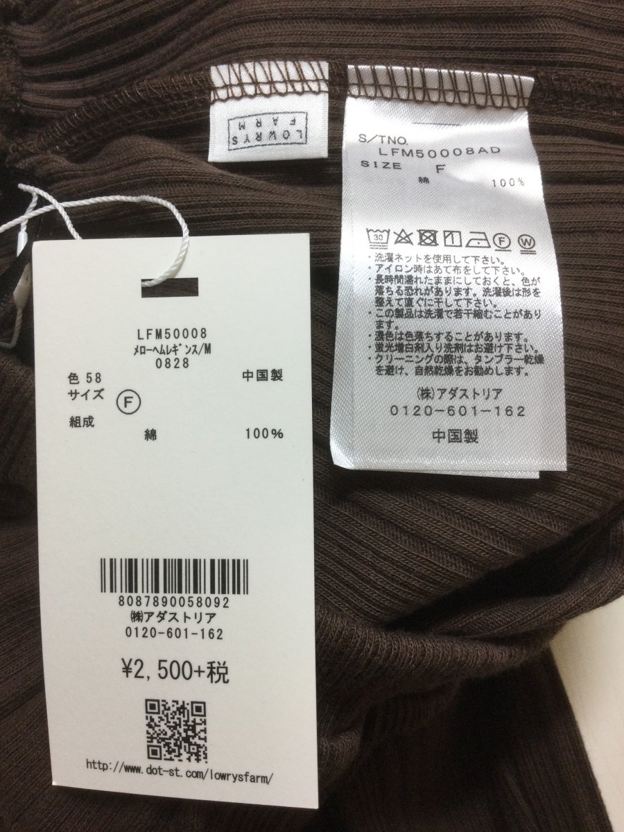 管理番号:10^137334 ローリーズファーム タグ付き未使用 メローヘムレギンス 茶色 ウエストゴム 表示サイズ:F 実寸(参考)