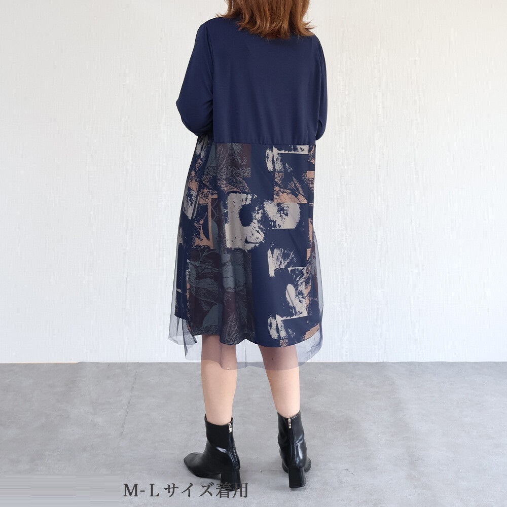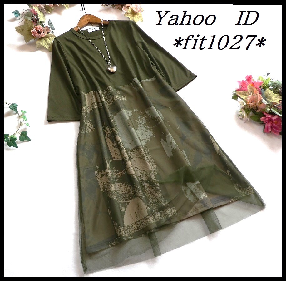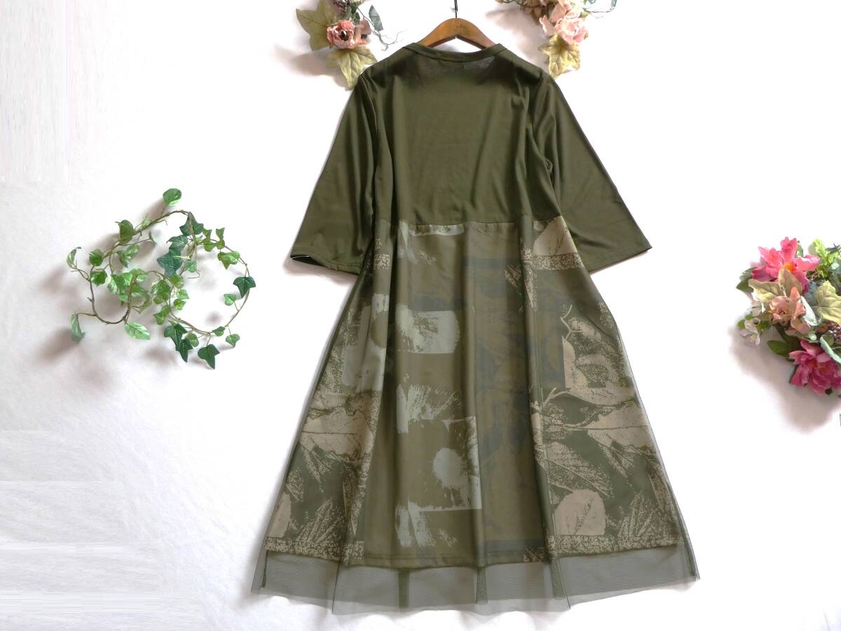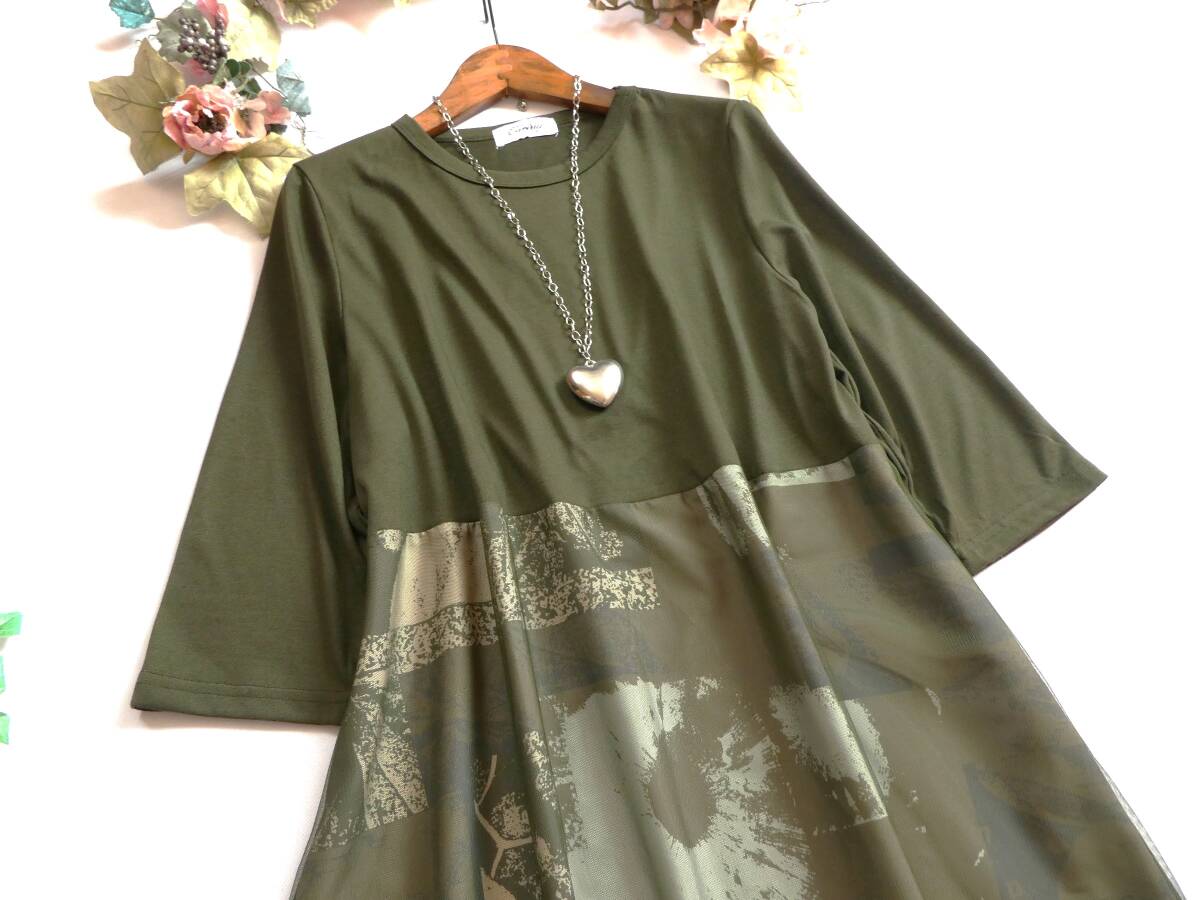 ゆったりサイズ【新品】異素材ドッキング☆シアーチュール×アートプリント★Aラインワンピ・チュニック・カーキ◆fit1027◆