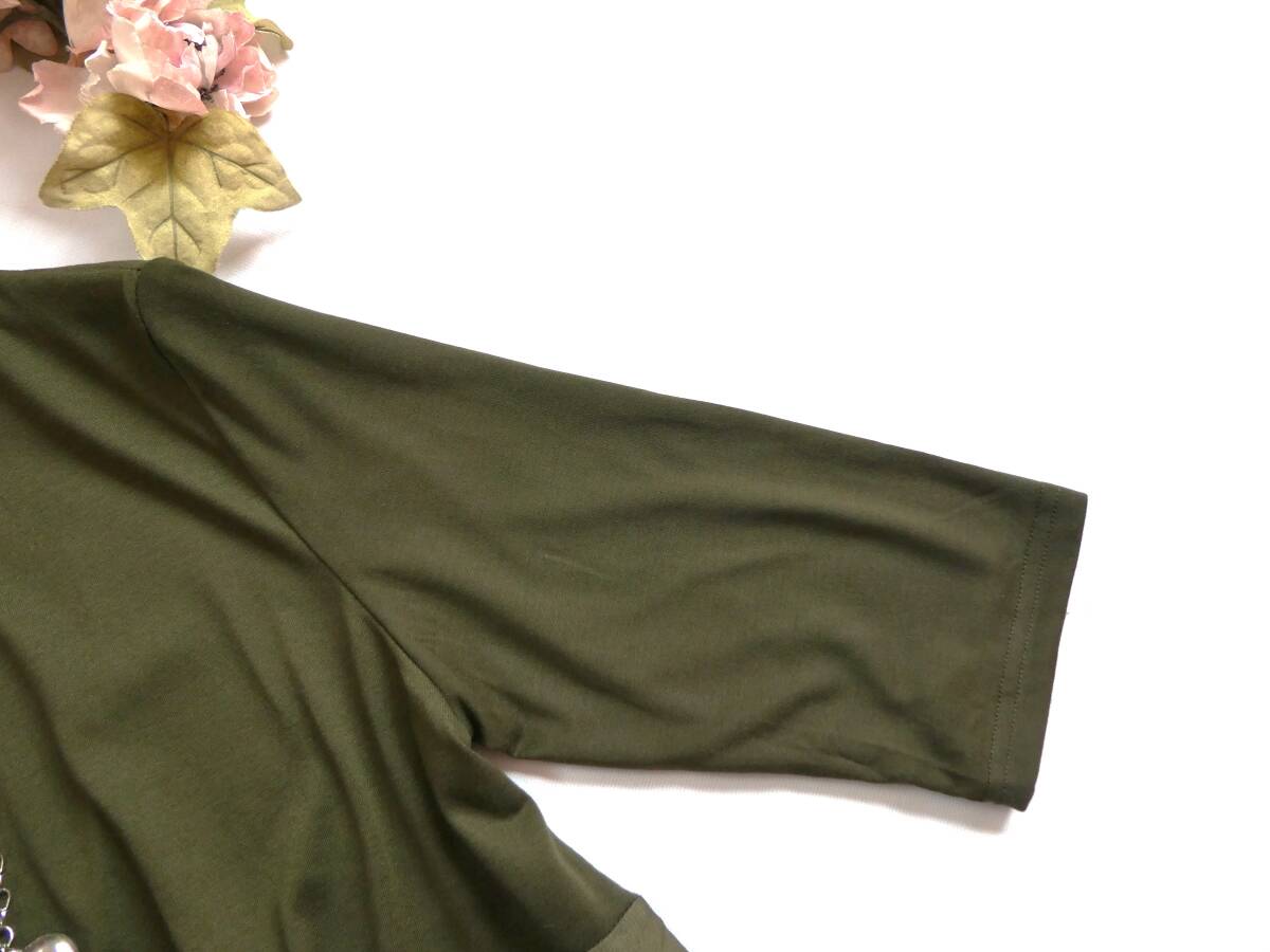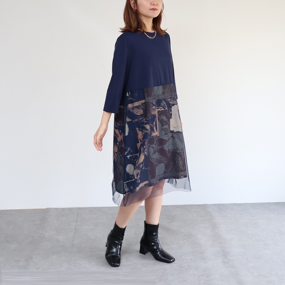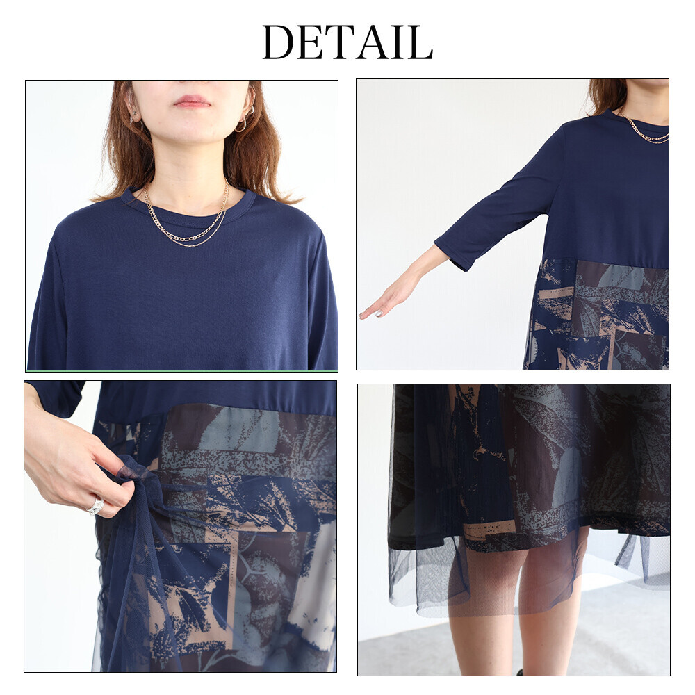 ゆったりサイズ【新品】異素材ドッキング☆シアーチュール×アートプリント★Aラインワンピ・チュニック・カーキ◆fit1027◆