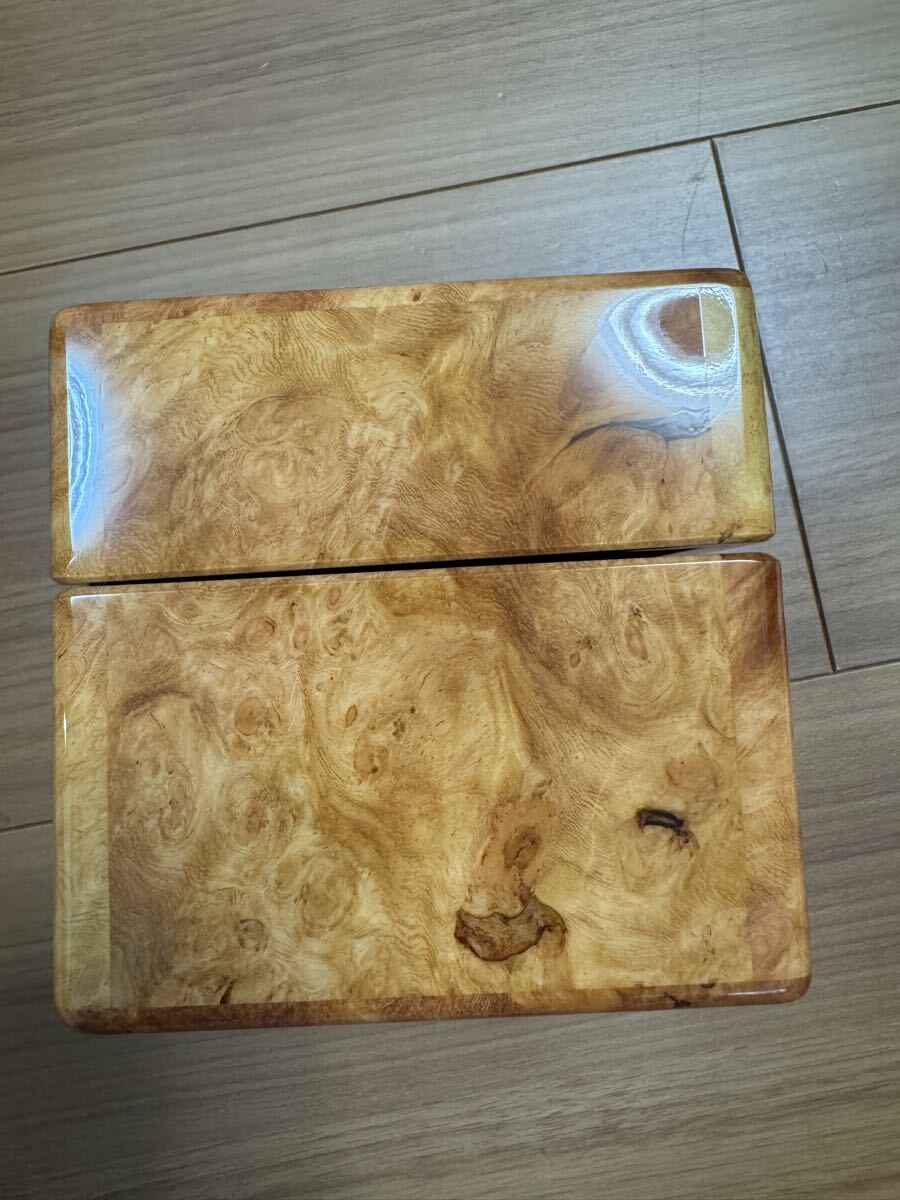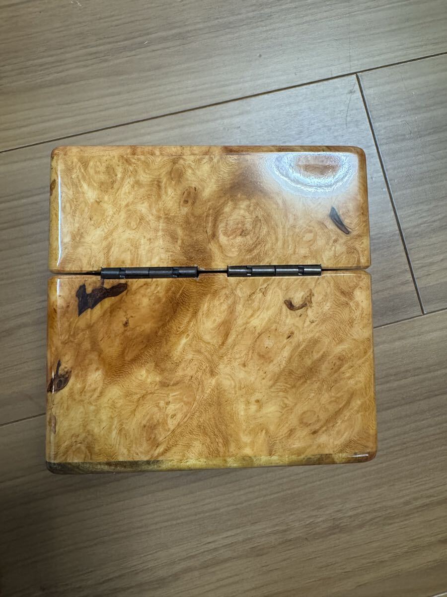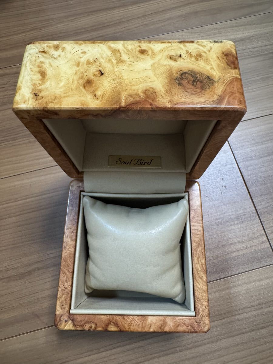 ソウルバードにて購入しました。1ヶ月くらい入れただけです。皮が非常に柔らかいので少し跡がついています。外側の花梨部分は綺麗です。写真写りが少しわるいですが、実物は大変綺麗な色になります。ノークレームノーリターンでお願いします。