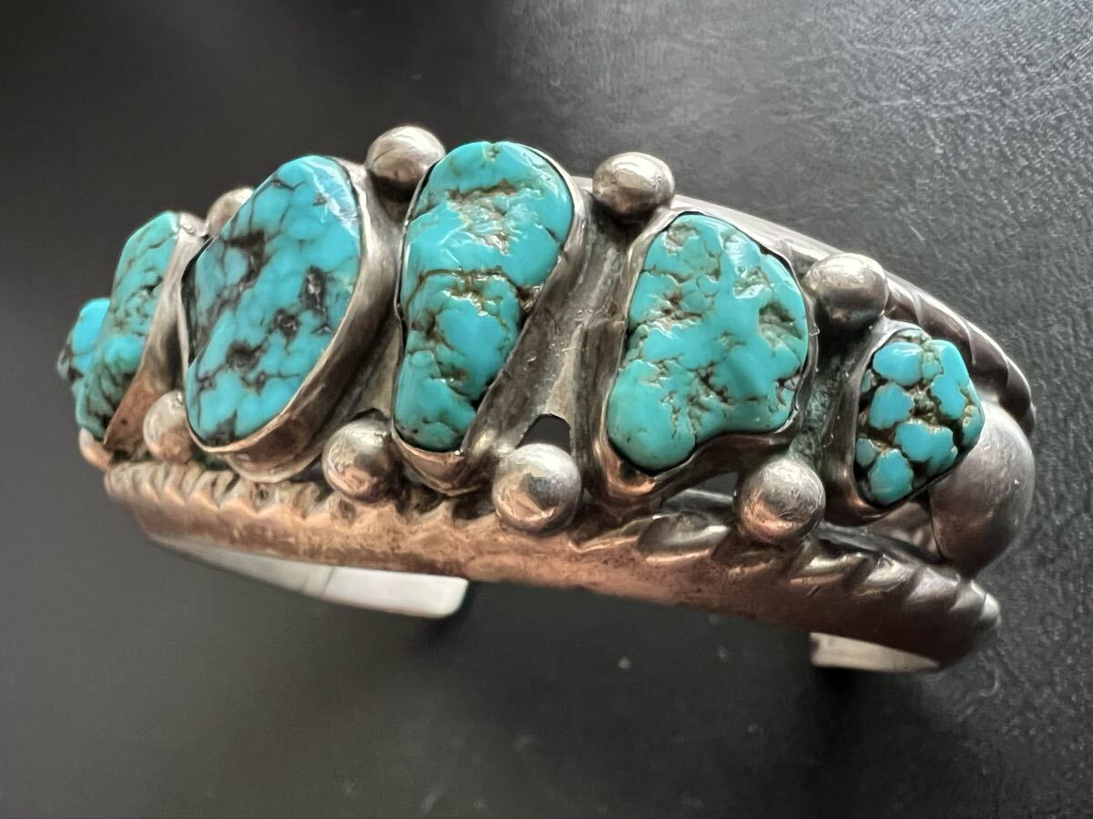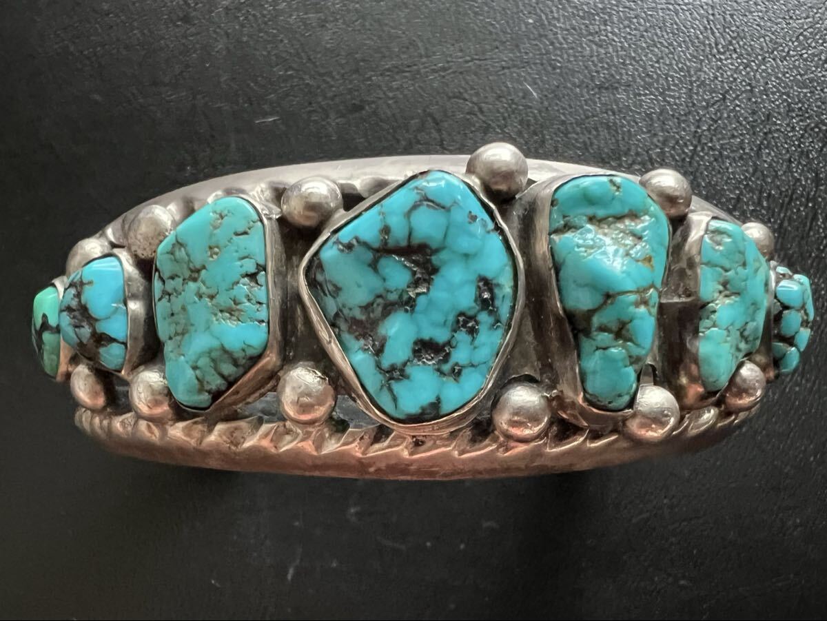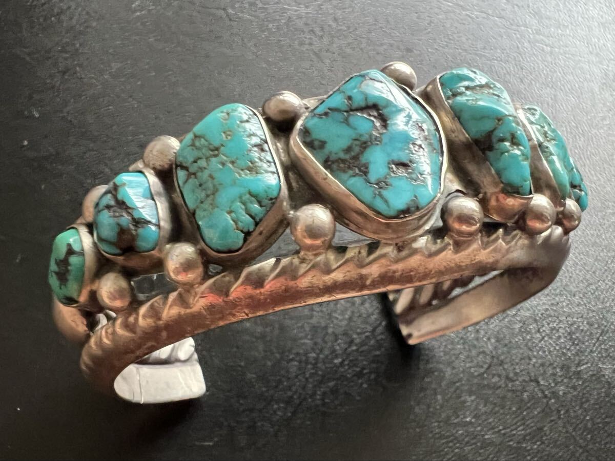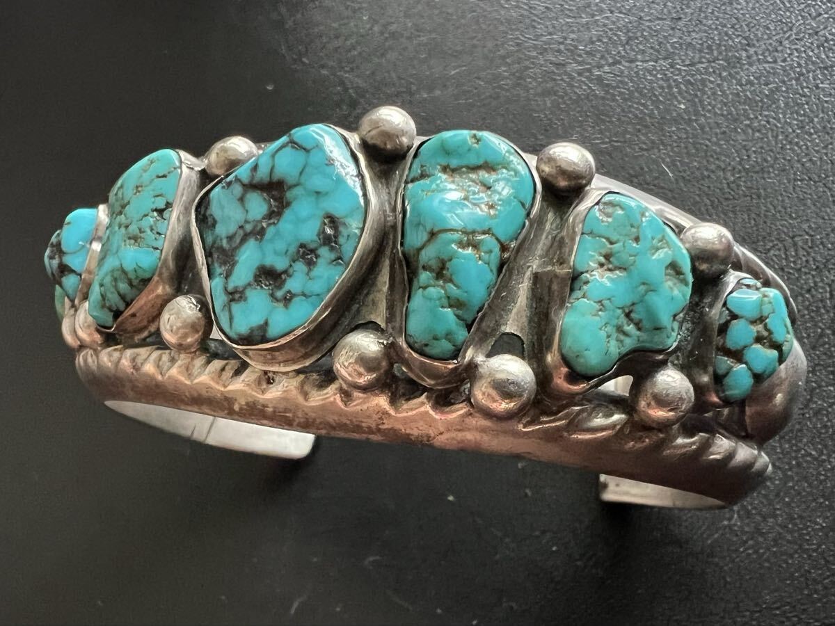 NAVAJO 【OLD PAWN】1950~60's GEM 7ターコイズ バングル Coin Silver インディアンジュエリー ズニ ホピ ナバホ