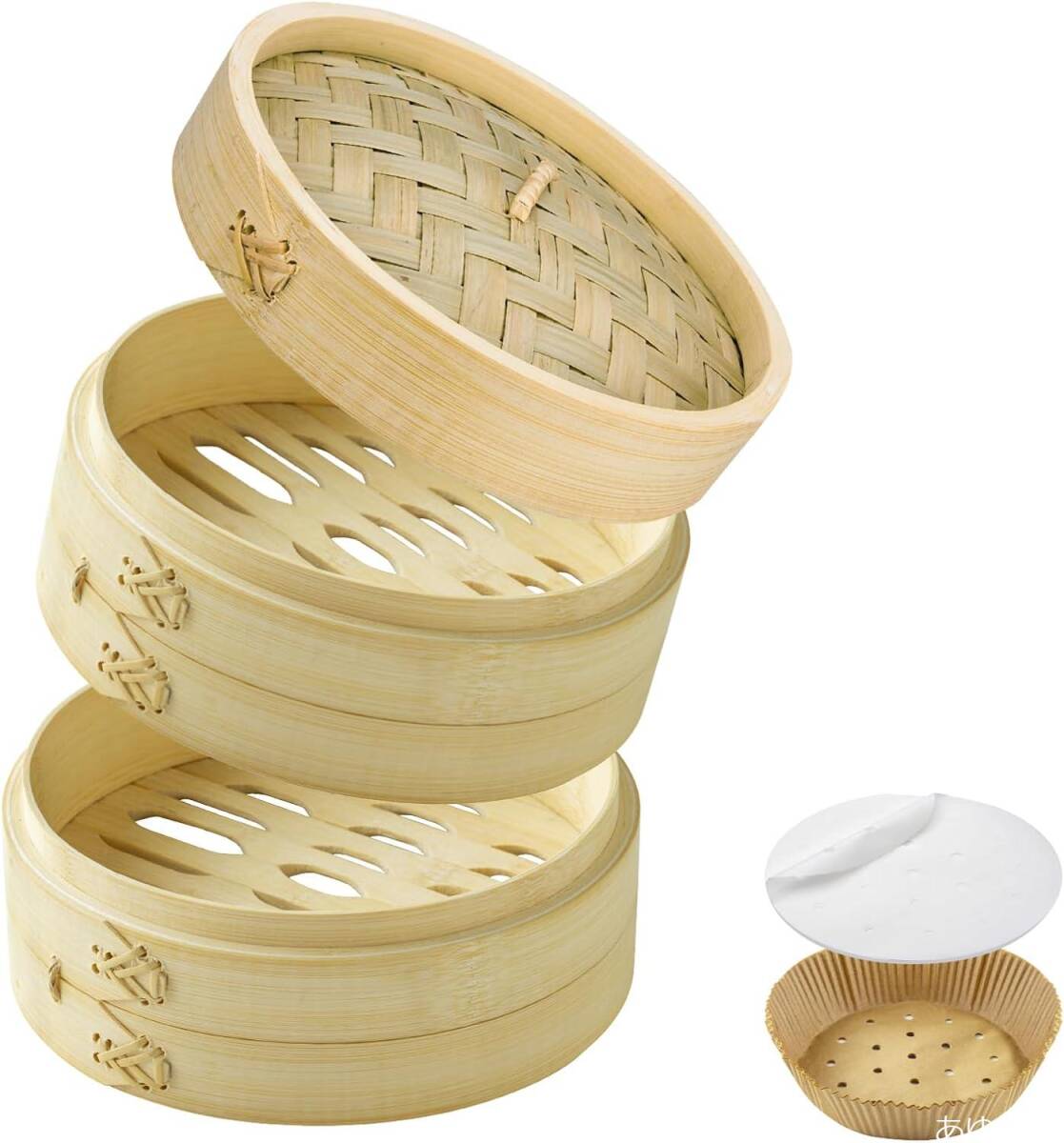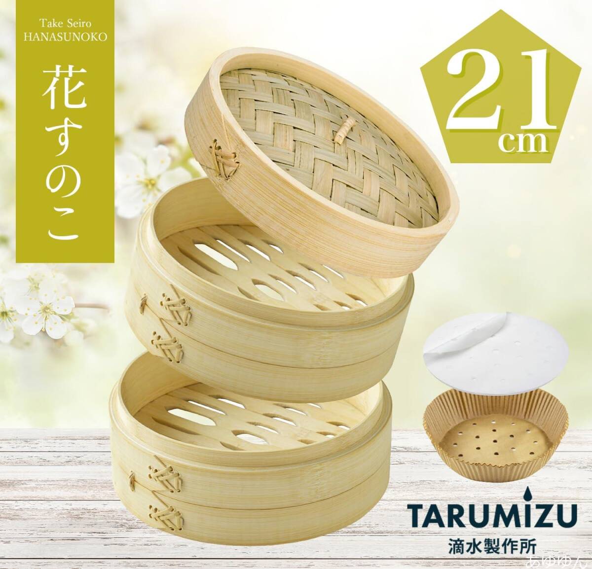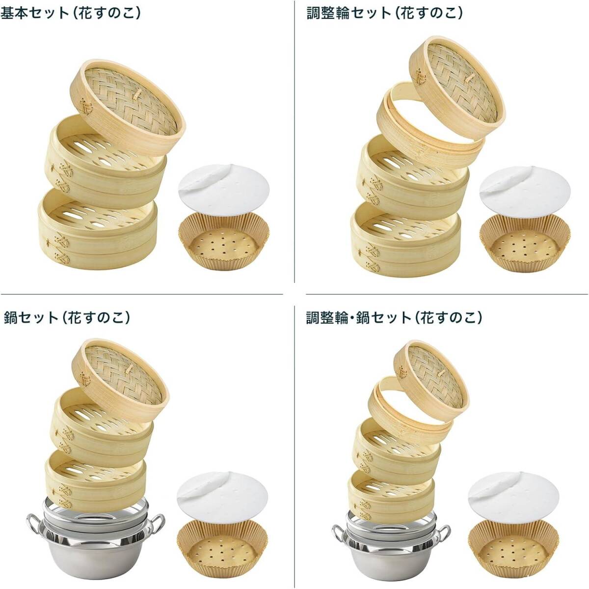 自社独自開発 蒸気の強さUP! 竹蒸篭 花すのこ 21cm セイロ2段 + 蓋 + セイロ専用用紙30枚付( 平面型20枚、タルト