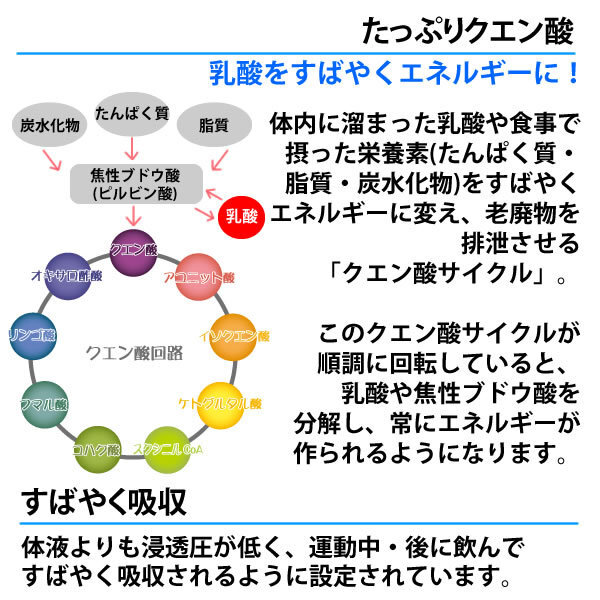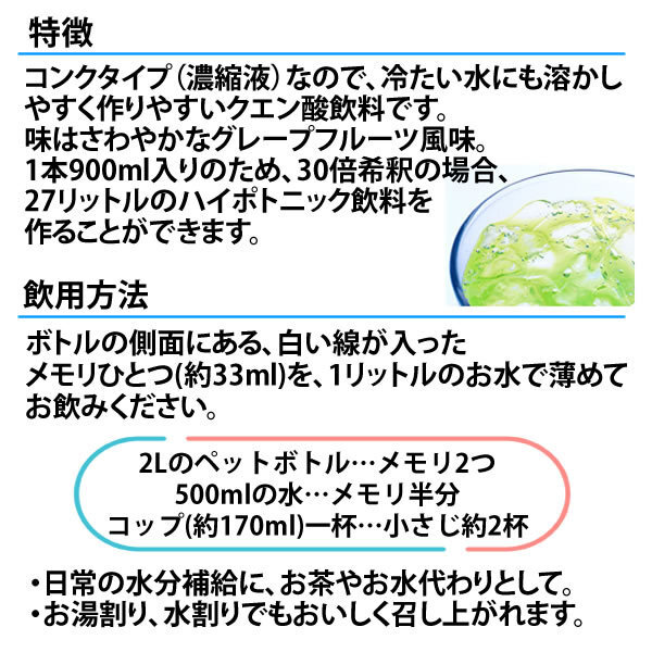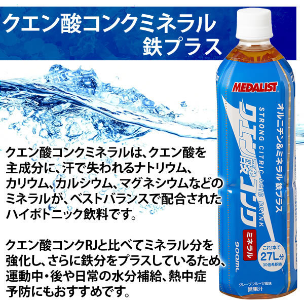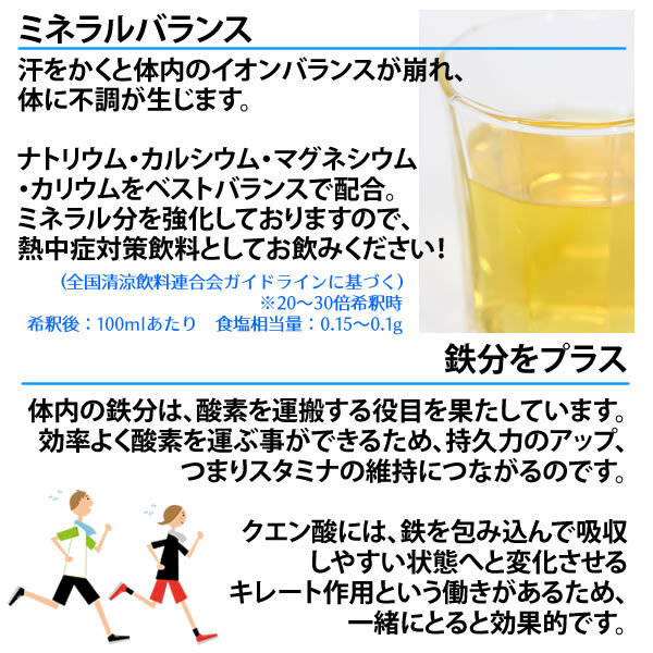 クエン酸コンクミネラルは、クエン酸を主成分に、汗で失われるナトリウム、カリウム、カルシウム、マグネシウムなどのミネラルが、ベストバランスで配合されたハイポトニック飲料です。 クエン酸コンクRJと比べてミネラル分を強化し、さらに鉄分をプラスしているため、運動中・後や日常の水分補給、熱中症予防にもおすすめです。 ■たっぷりクエン酸 体内に溜まった乳酸や食事で摂った栄養素(たんぱく質・脂質・炭水化物)をすばやくエネルギーに変え、老廃物を排泄させる「クエン酸サイクル」。 このクエン酸サイクルが順調に回転していると、乳酸や焦性ブドウ酸を分解し、常にエネルギーが作られるようになります。 ■すばやく吸収 体液よりも浸透圧が低く、運動中・後に飲んですばやく吸収されるように設定されています。 ■ミネラルバランス 汗をかくと体内のイオンバランスが崩れ、体に不調が生じます。 ナトリウム・カルシウム・マグネシウム・カリウムをベストバランスで配合。 ミネラル分を強化しておりますので、熱中症対策飲料としてお飲みください! (全国清涼飲料連合会ガイドラインに基づく) ※20~30倍希釈時 希釈後:100mlあたり 食塩相当量:0.15~0.1g ■鉄分をプラス 体内の鉄分は、酸素を運搬する役目を果たしています。 効率よく酸素を運ぶ事ができるため、持久力のアップ、つまりスタミナの維持につながるのです。 クエン酸には、鉄を包み込んで吸収しやすい状態へと変化させるキレート作用という働きがあるため、一緒にとると効果的です。 ■特徴 コンクタイプ(濃縮液)なので、冷たい水にも溶かしやすく作りやすいクエン酸飲料です。 味はさわやかなグレープフルーツ風味。 1本900ml入りのため、30倍希釈の場合、27リットルのハイポトニック飲料を作ることができます。 ■飲用方法 ボトルの側面にある、白い線が入ったメモリひとつ(約33ml)を、1リットルのお水で薄めてお飲みください。 ・2Lのペットボトル…メモリ2つ ・500mlの水…メモリ半分 ・コップ(約170ml)一杯…小さじ約2杯 運動時だけでなく、日常の水分補給に、お茶やお水代わりとしてもおすすめです。 お湯割り、水割りでもおいしく召し上がれます。 | ||||||||||||||||||||||||||||||||||||