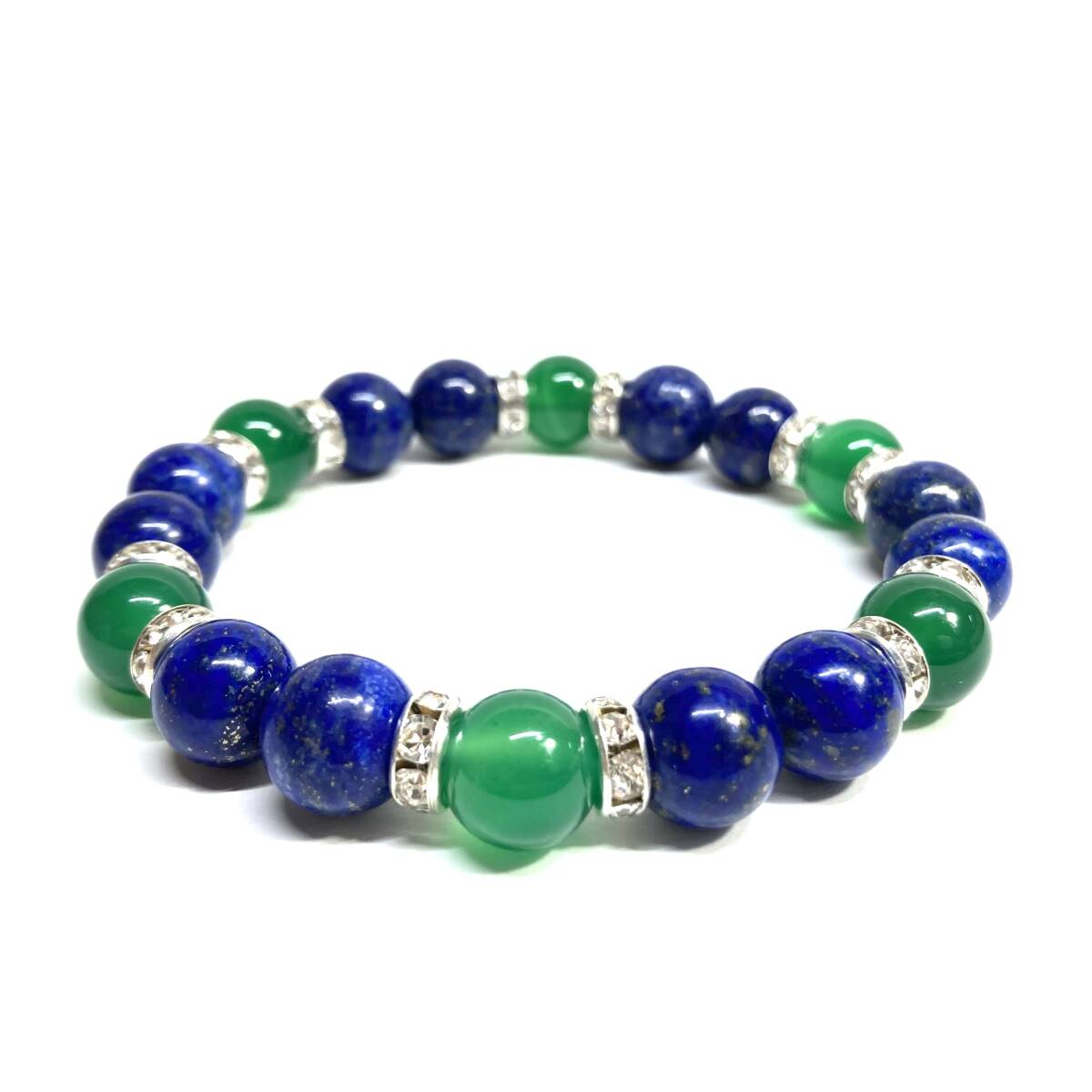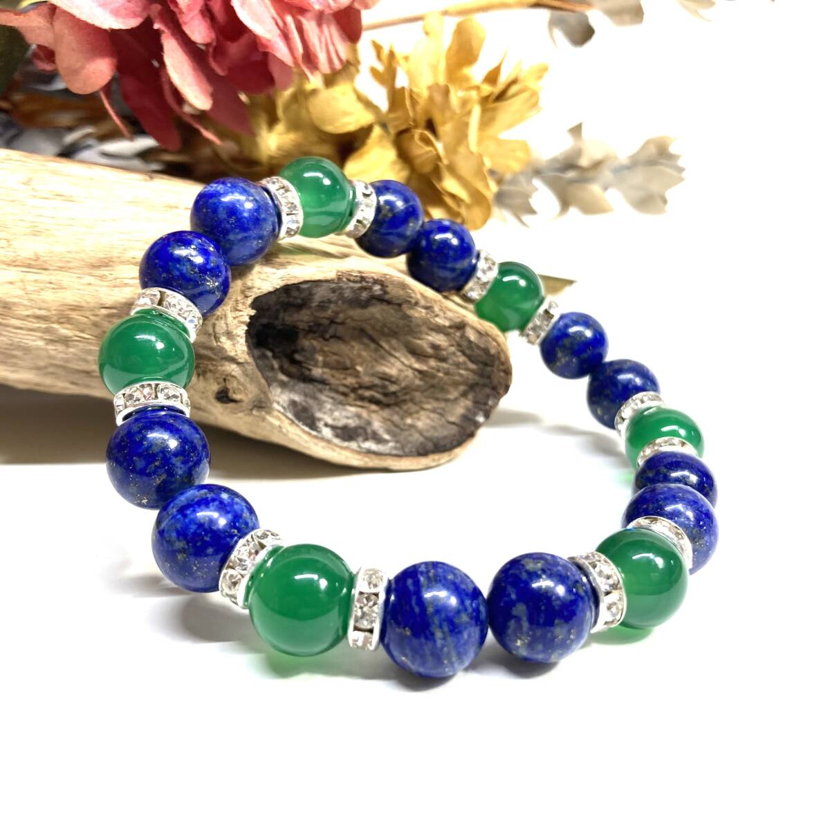 こちらは、ラピスラズリと緑瑪瑙を組み合わせたパワーストーンブレスレットです。間にはロンデルを挟み高級感あるデザインに仕上げております。石大きさは腕にも馴染みやすいように10mm玉で内径約18cm(伸可能)です。(サイズ変更の場合は取引ナビにてご連絡をお願いします。) 数に限りがございますので気になる方はお早めにどうぞ。