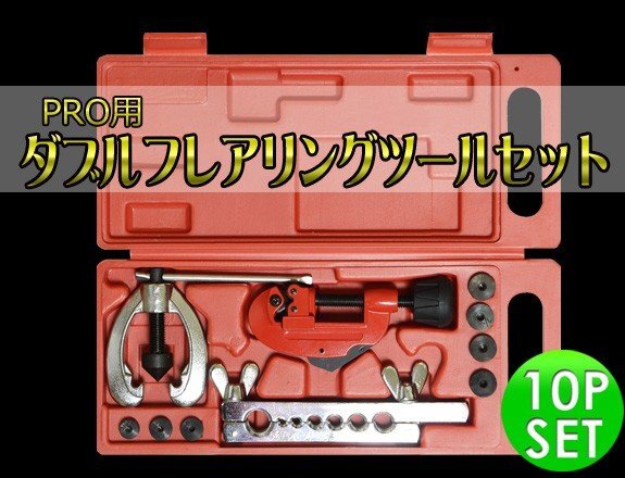 クーラーやブレーキパイプの先端にフレア加工を施すために必要なツールを揃えたダブルフレアリングツールキットです。 |