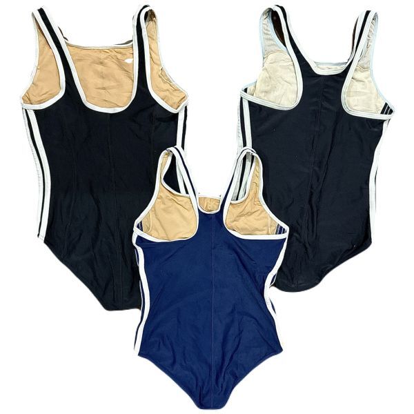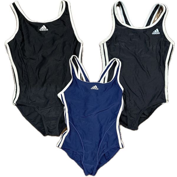 40【3枚セット】アディダスadidas女子競泳水着160(Lサイズ程度)★光沢ネイビー濃紺ブラック黒ホワイト白3本ライン★大きいサイズ男性も