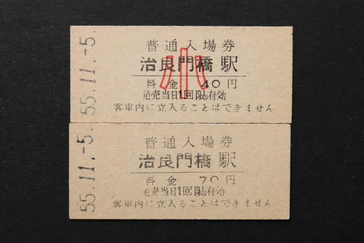 東武鉄道入場券 冶良門橋駅 大人券小児券2枚セット 70