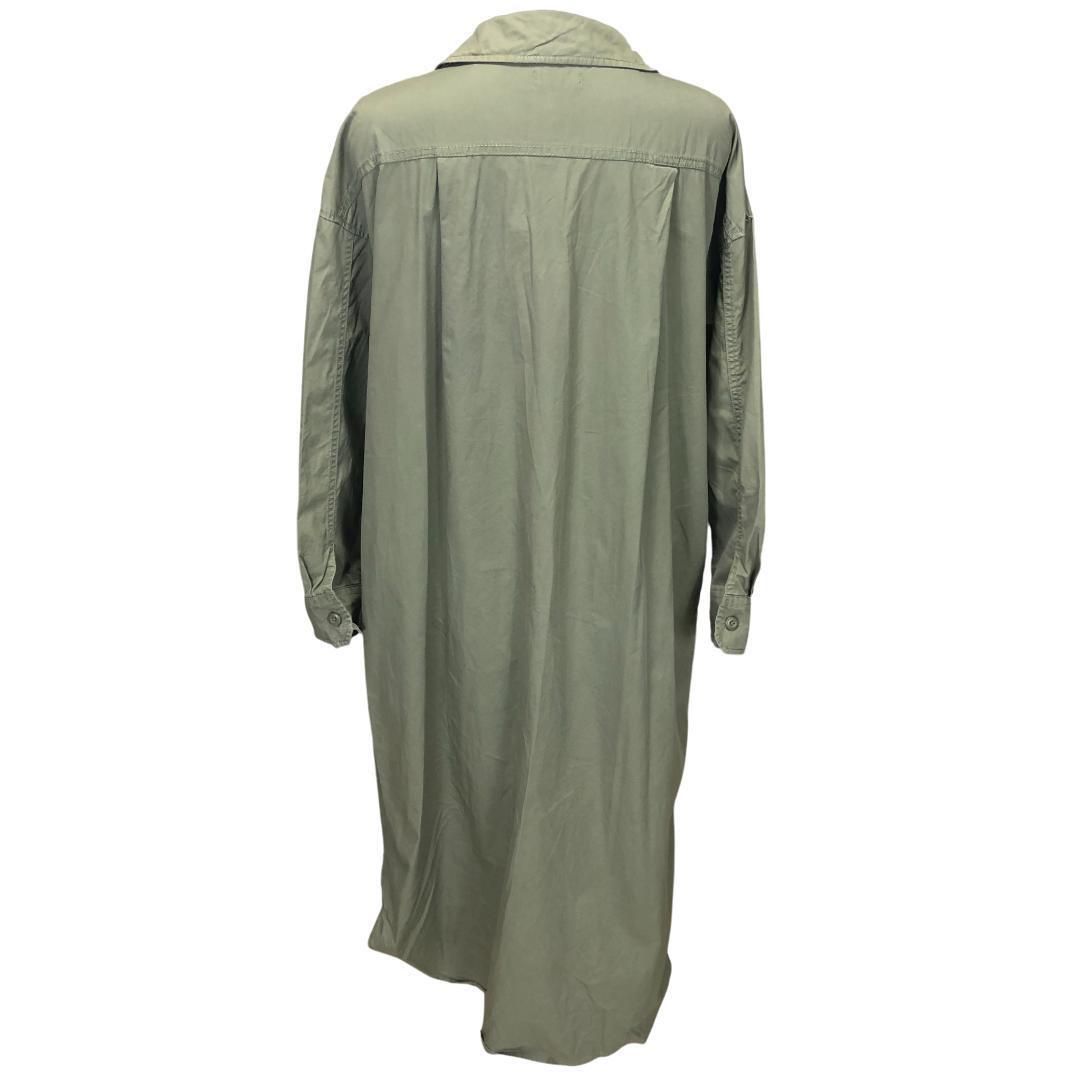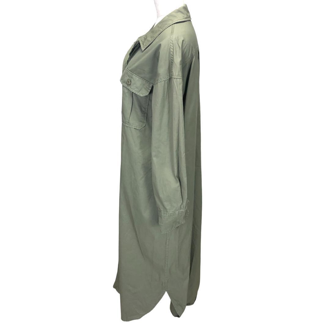 カジュアルながらも上品な印象のロング丈シャツワンピースです。深みのあるオリーブグリーン色・両胸のフラップポケットがデザインのアクセントになっています。両サイドにもポケットがあります。フロントボタンにて着脱。両サイド裾にスリット有り。一枚でさらりと着こなしたり、羽織りとしても活用できる着回し力抜群のアイテムです。身長160cm着用で、足首より10cm位上の丈です。