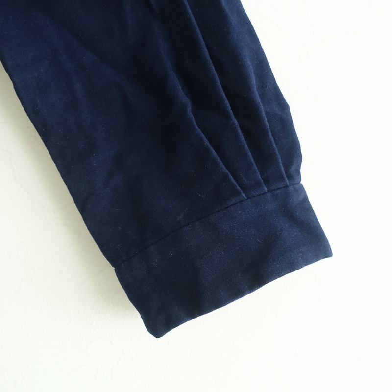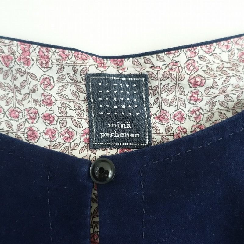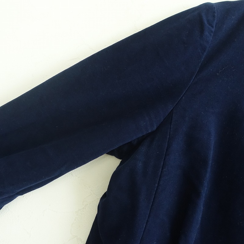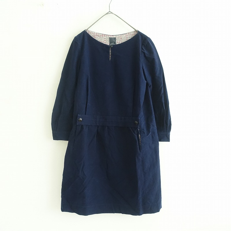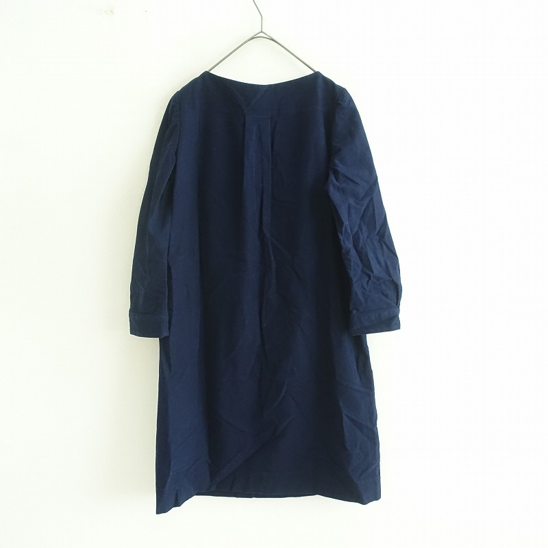 mina perhonenのpowder 起毛ワンピースです。カラーはネイビーで、短起毛のやや厚手素材です。フロントセンターループボタン1ヶ所留めでボタン下にスリットがあり、ネックからスリット周りにステッチがあしらわれております。フロントウエストに飾りフェイクベルトが施されており、フロント左右にポケットがあり、身頃のみスリーピングローズの裏地付きです。 |