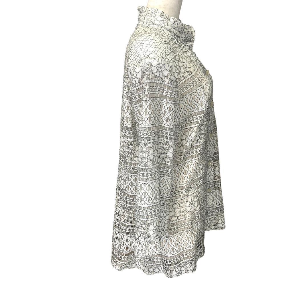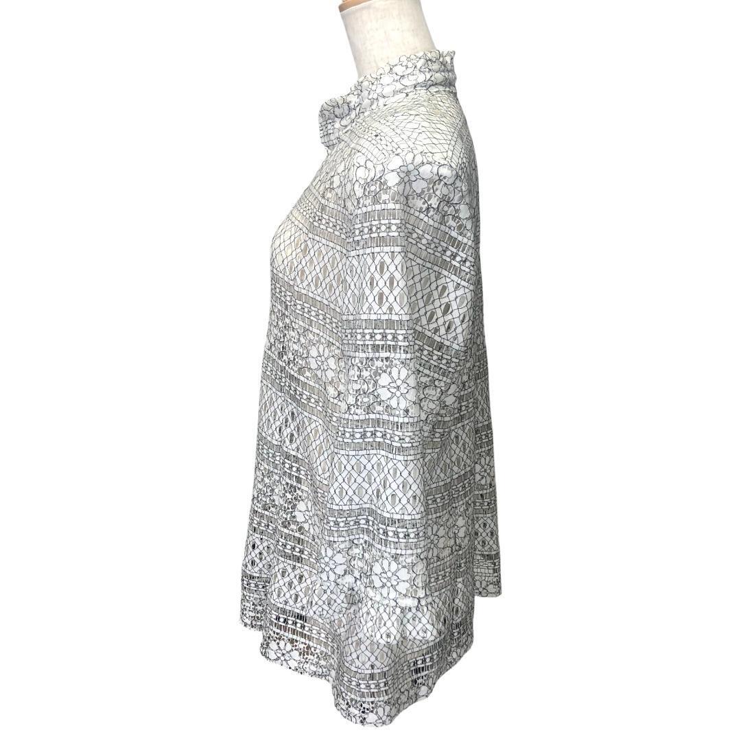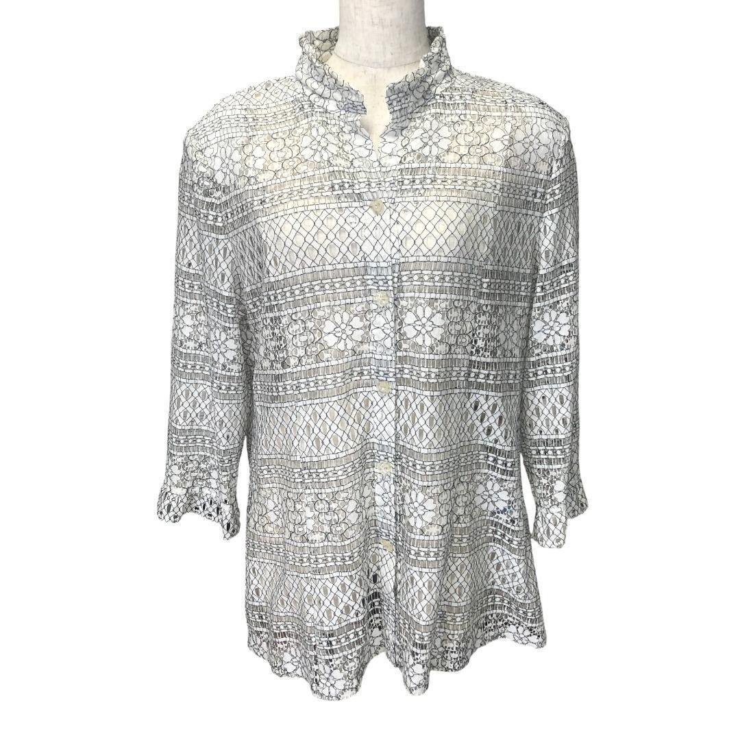 透け感のある繊細なレース編みのブラウスです。首元はフリルネックになっていて、上品な印象を与えます。白色の薄い肩パッドがついています。7分袖なので、春から秋口まで長く着用いただけます。