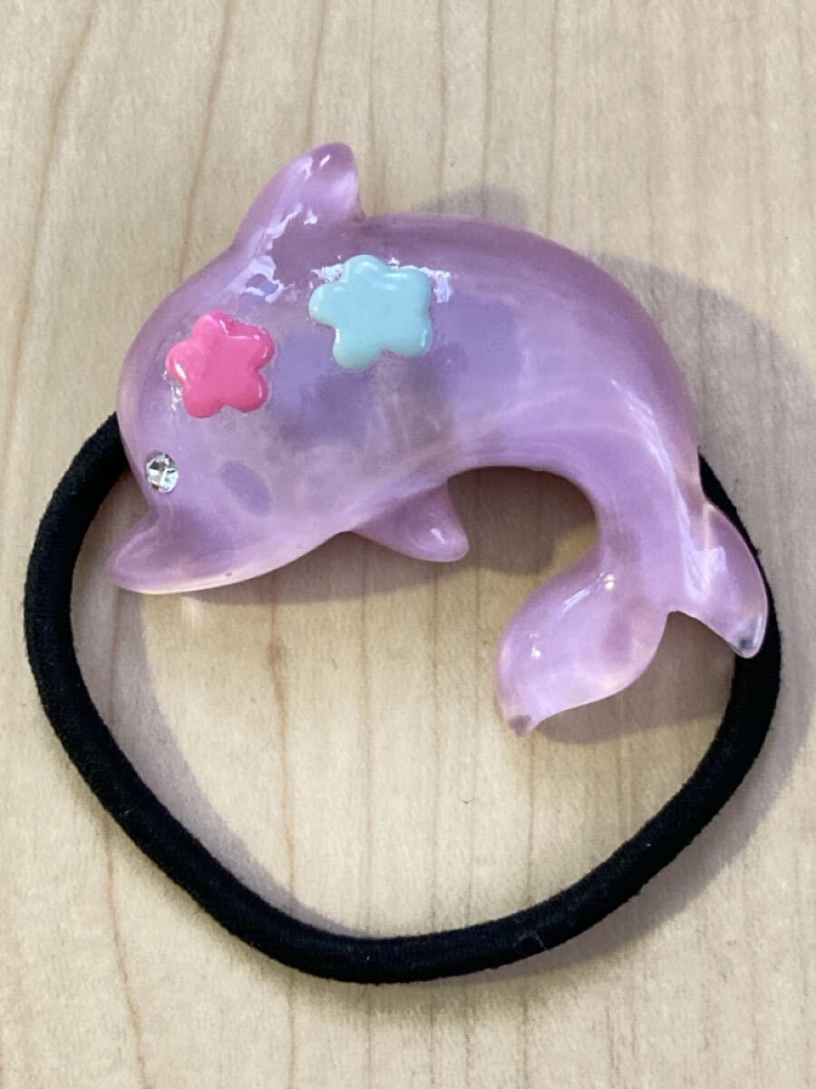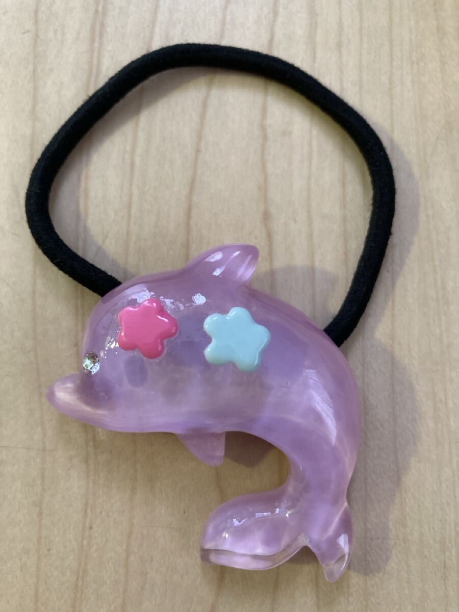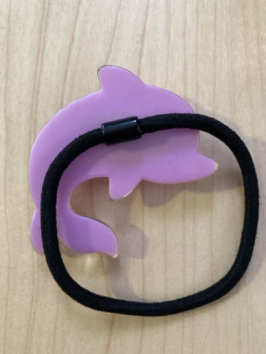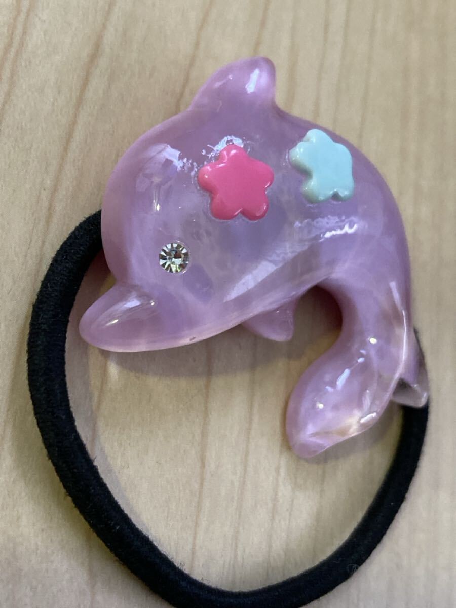 イルカ型のピンクまたはパープルに近い色ののヘアゴムになります。
