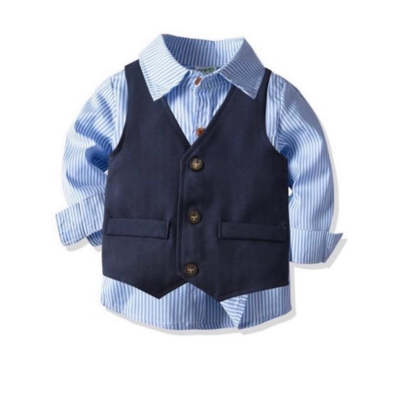 水色 の ストライプシャツ に 濃紺 のベストが オシャレ で 高級感 があります。