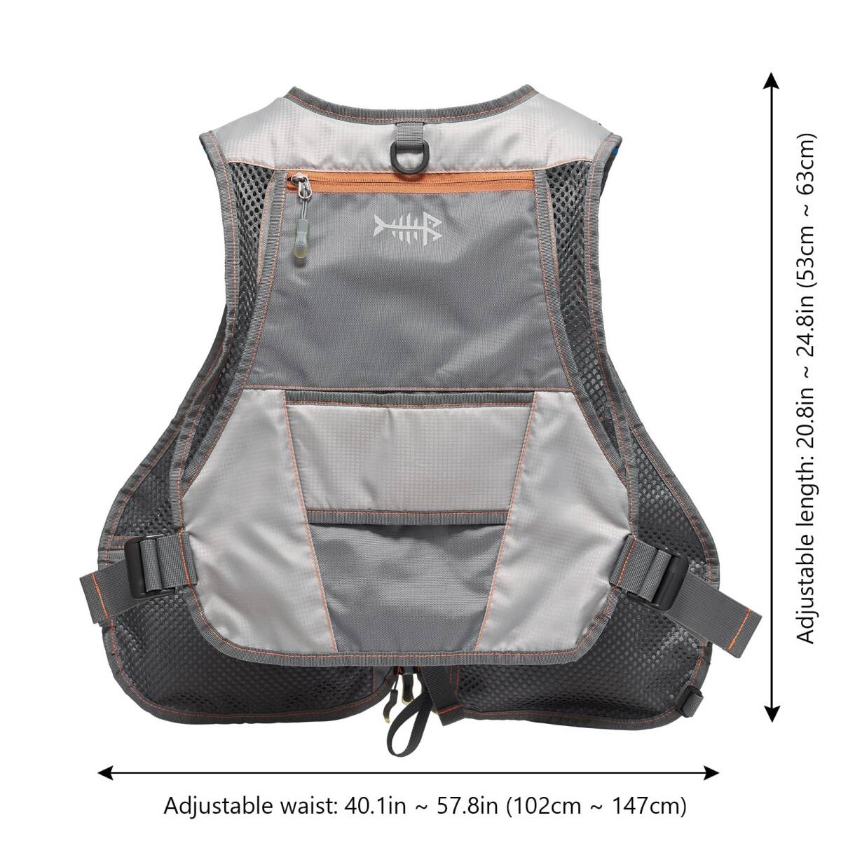 フリーサイズ。メンズ用釣りベスト:着丈:53〜63cm、ウェスト:102〜147cm 調節可能。レディース用釣りベスト:着丈:46〜56cm、ウェスト:100〜144cm 調節可能。
