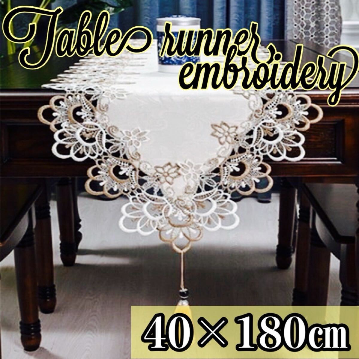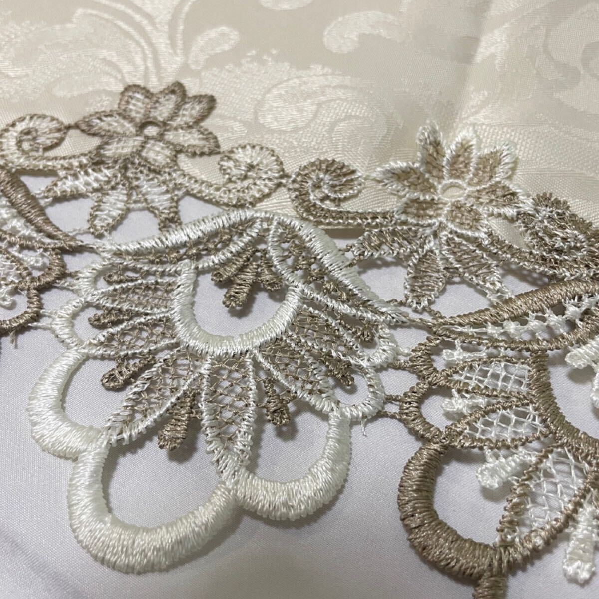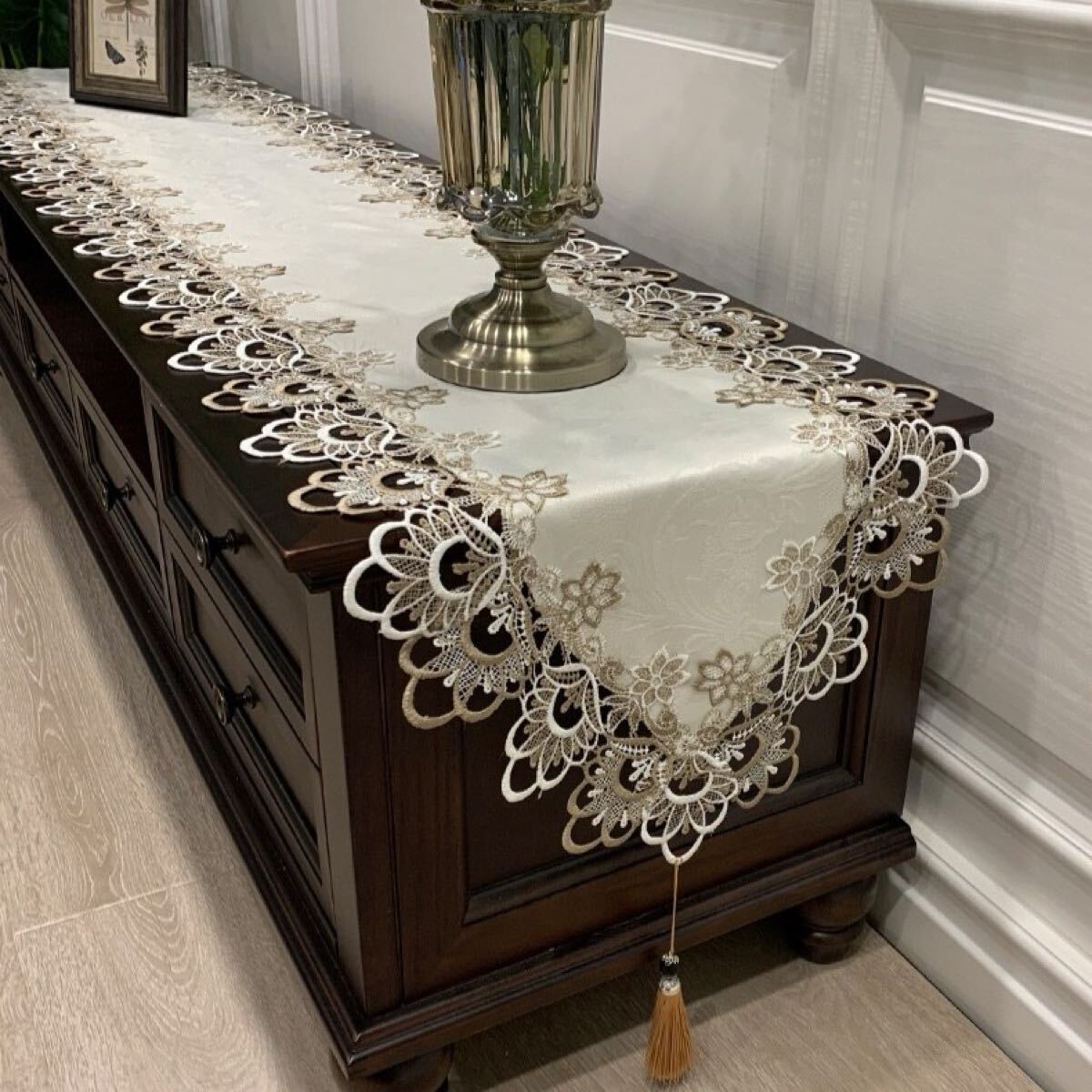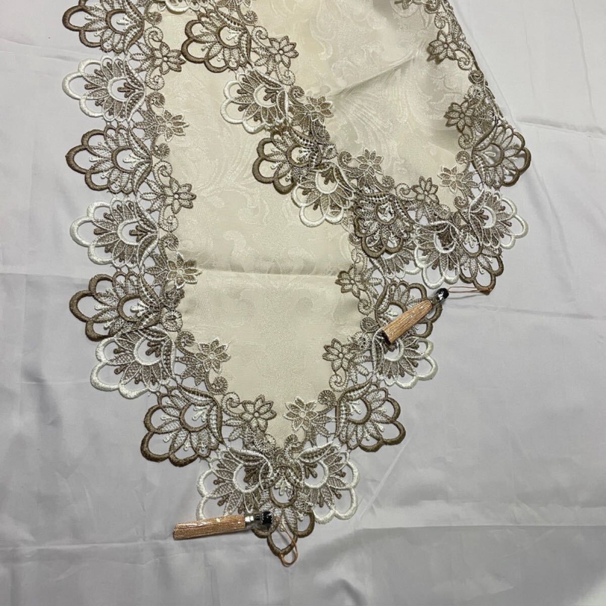 刺繍部分の透け感がテーブルの色を引き立て、両サイドのタッセルが上品な雰囲気を演出します。