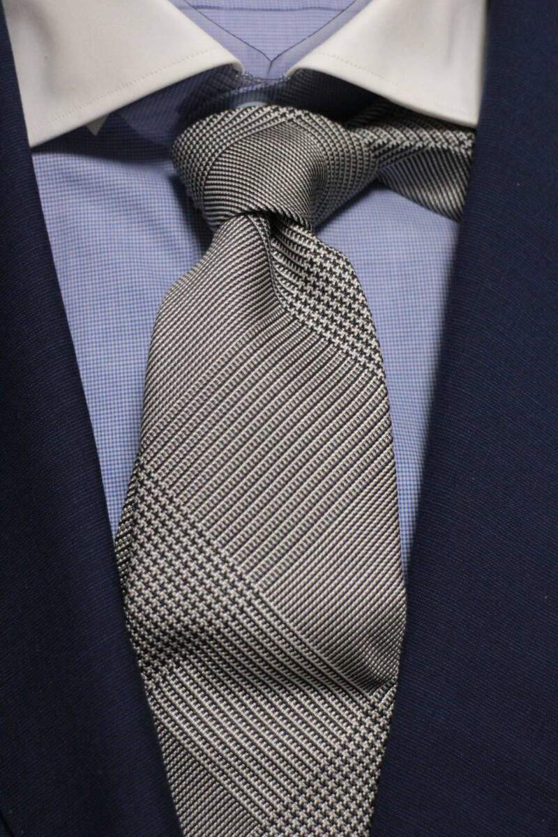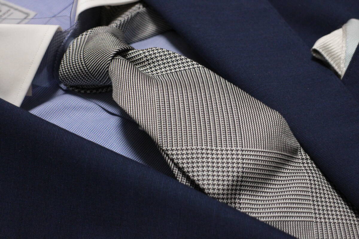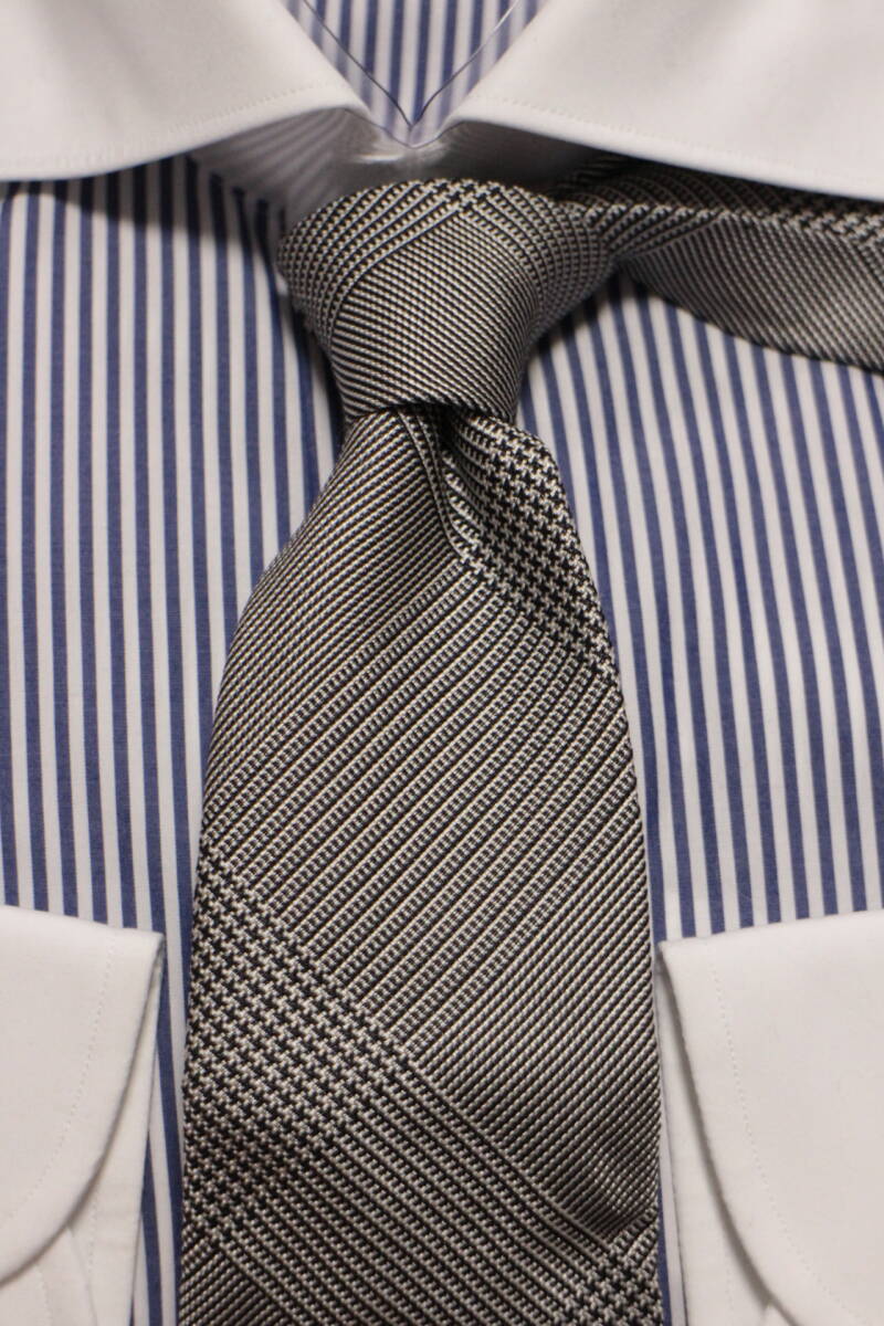グレンチェックのネクタイは流行に左右されず、一本持っておけば間違いなし。