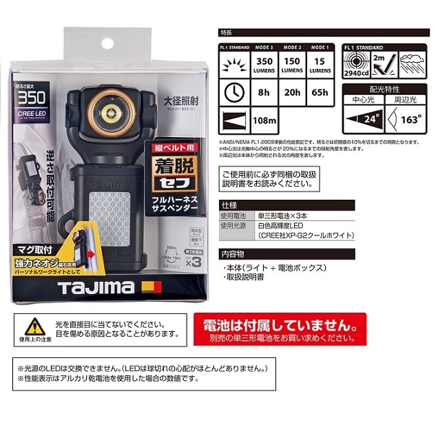 タジマ製のLEDセフ着脱式ライト・ハ-ネス着脱可能ワークライトのLE-SF351D(乾電池別売)です。