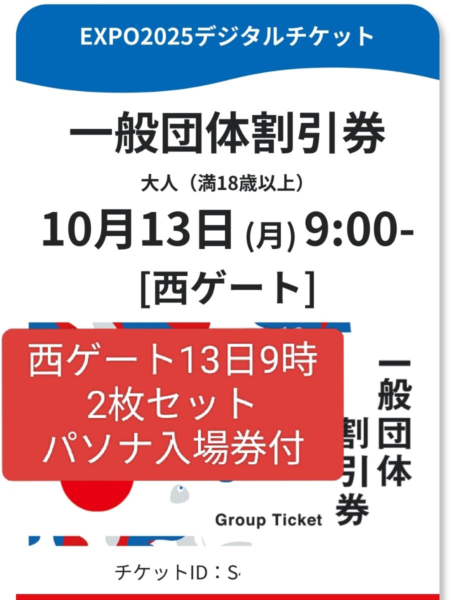 大阪万博 西ゲート10月13日9時 大人 一日券2枚セット パソナ11時〜11時半入場券付