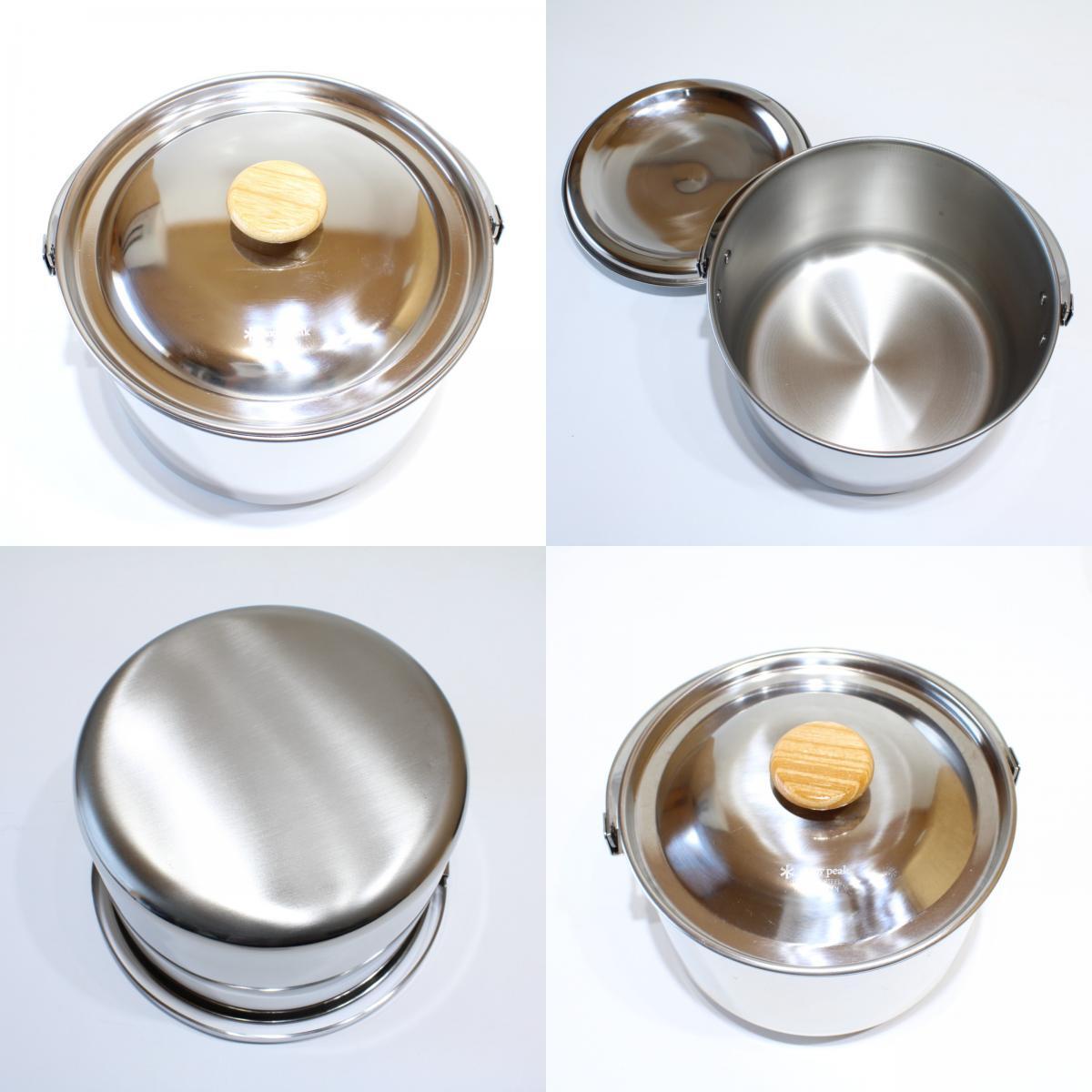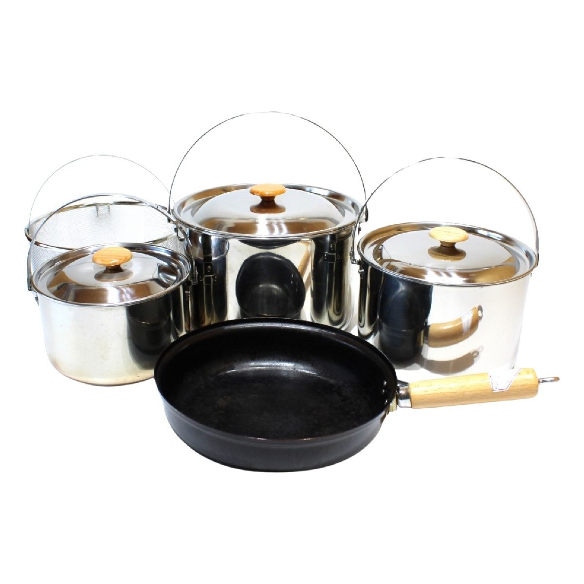 ・容量:6.6L(230ビリーポット)、4.3L(200ビリーポット)、3L(180ビリーポット) ・仕様:● 230ビリーポット/6.6L・ステンレス0.5mm厚、200ビリーポット/4.3L・ステンレス0.5mm厚、180ビリーポット/3L・ステンレス0.5mm厚、メッシュバスケット/ステンレス、フライパン/黒皮鉄板1.2mm厚、ツマミ・ハンドル/天然木、メッシュケース、ハンドルケース兼鍋つかみ