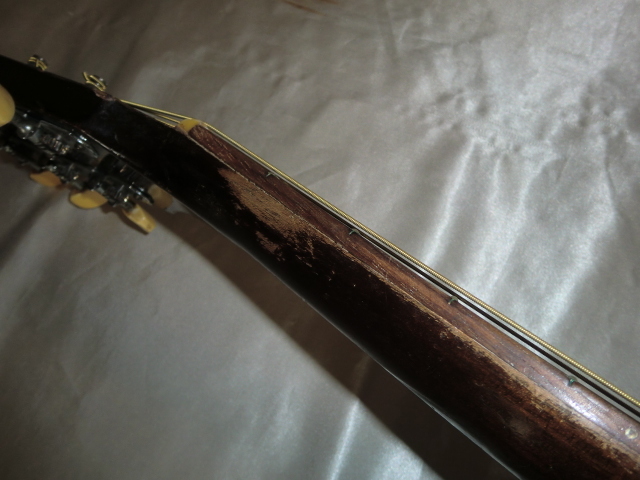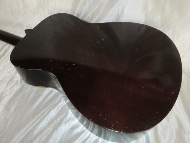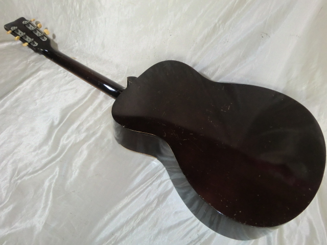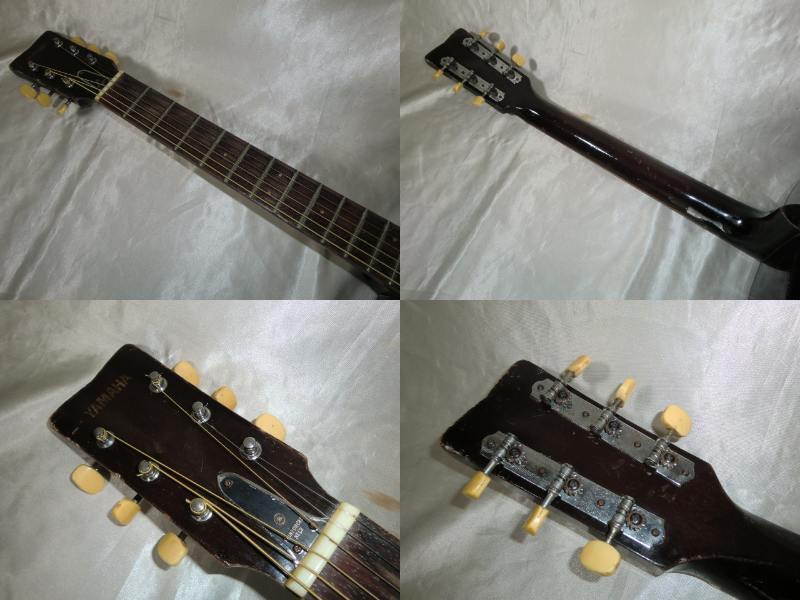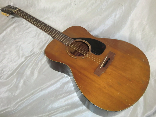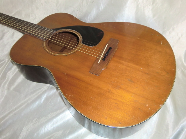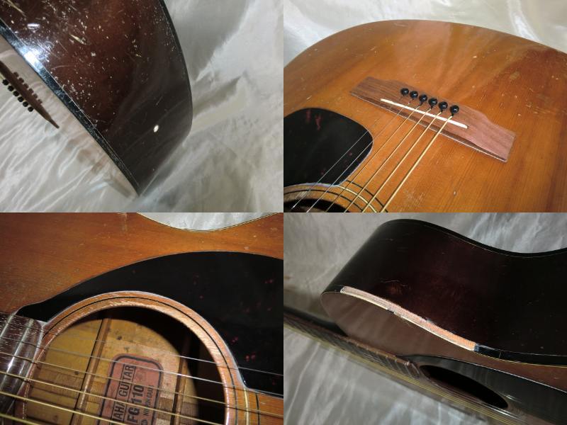 初期型赤ラベル YAMAHA FG-110です。 初期型なのでヘッドロゴは音叉ロゴではなくYAMAHAロゴになります。 1970年代前半の50年以上経過した古い機種で無数の傷や打痕があります。 サウンドホールの削れやネックの塗装剥がれがなどがありかなり弾き込まれているようでフレットも50%残位です。 1弦側サイドのバインディングが約10cm位剥がれて欠品しています。 エンドピンが欠品です。 サドルとブリッジピンの間にテンション溝を入れてあります。 ボディー内部と外部はクリーニングしていますのでベタベタ感などはありません。 現状お渡しなので弦高やその他、細かい調整やリペアなどはリペアショップに任せるか落札者様にて調整して下さい。 細かい事が気になる方や美品を好まれる方には不向きです。 現状のままでも使用出来ますがシャンク扱いとさせて頂きます。 スペック トップ:スプルース サイド:楓 バック:楓 12F 弦高 1弦:約3.0mm 6弦:約3.2mm 付属品:YAMAHA純正オリジナルソフトケース |