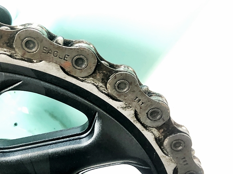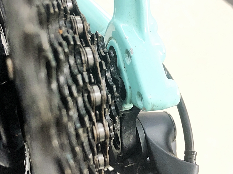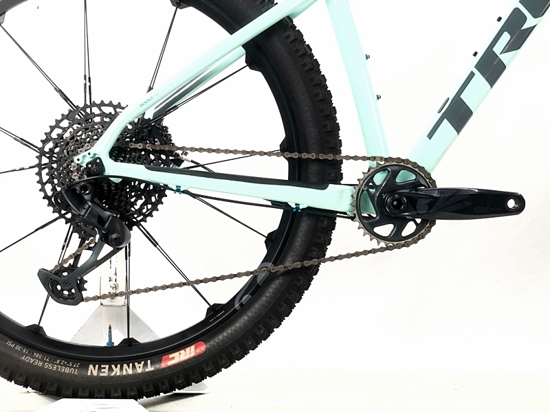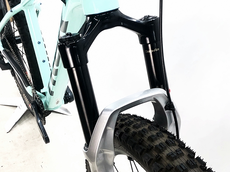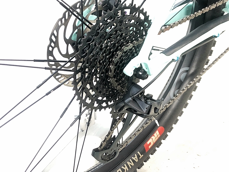 フレーム、その他外観:BBドライブサイド、右フレームエンド内側にチェーン落ちキズがあります。フレーム全体にキズがあります。クランク、ハンドルにキズがあります。チェーンにサビが見られます。リアホイールはQR141のブースト規格です。フロントサスは140mmトラベルの29er用が装着されています。