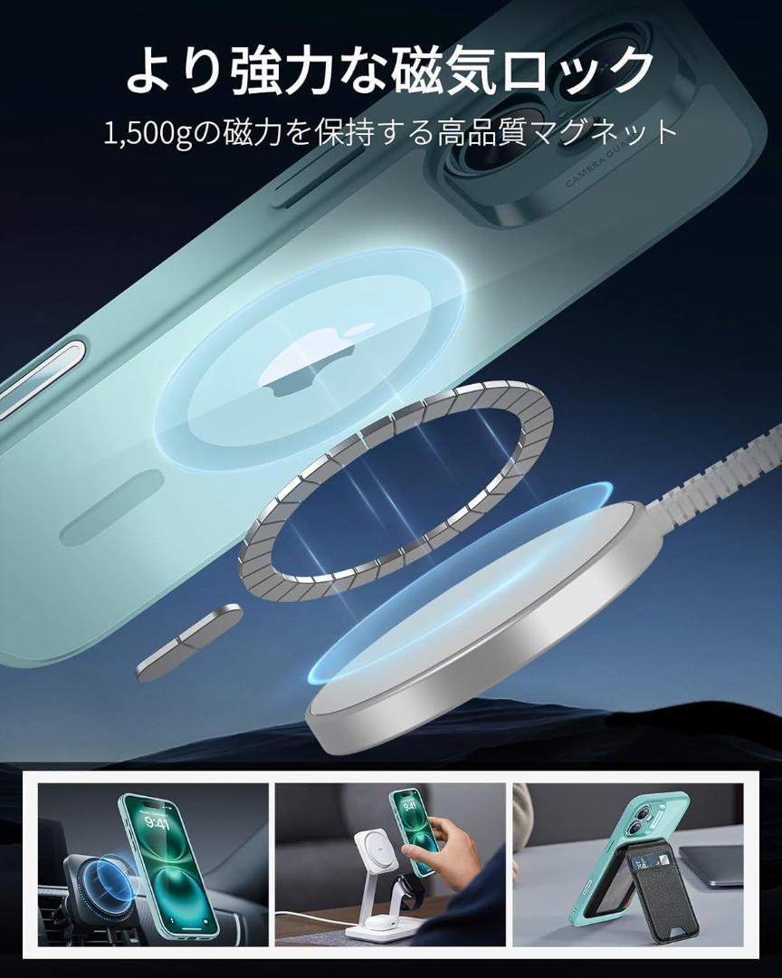 【ズレない・外れない!最強マグネット〈1,500gの保持力〉】 業界トップクラスの強力磁力(1,500gの保持力)を内蔵したケースです!MagSafeワイヤレス充電器やアクセサリーが瞬時に「ピタッ」と吸着するため、位置調整の手間が不要です。