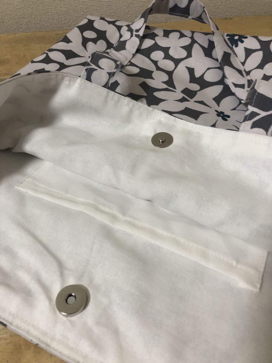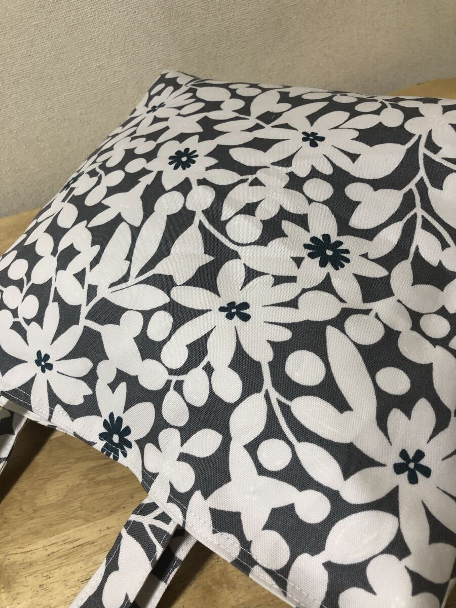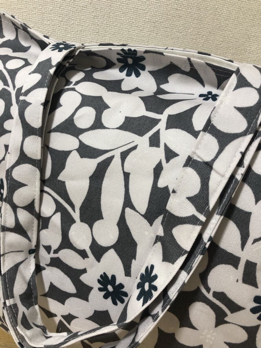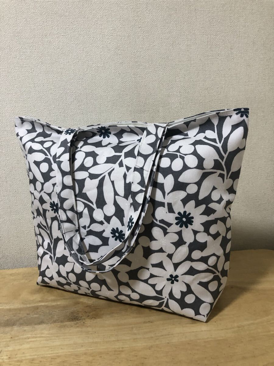 アクセスありがとうございます。グレー系花柄の生地で大きめ肩掛けトートバックを作りましたサイズは縦30×横40まち10持ち手48センチです。まちをたっぷりとっておりますので荷物も沢山入りますよ。送料はレターパックライト430円でお届けできます。他にも出品しておりますので宜しければご覧ください。