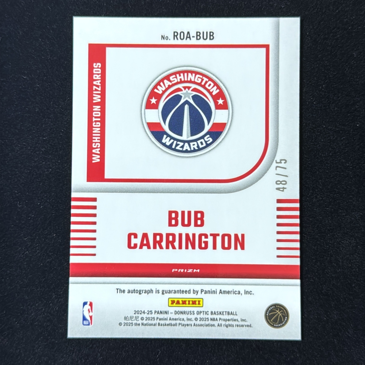 Bub Carrington バブ・カリントン Panini Donruss Optic 2024-2025 /75 RC Auto 直筆 サイン Wizards ウィザーズ