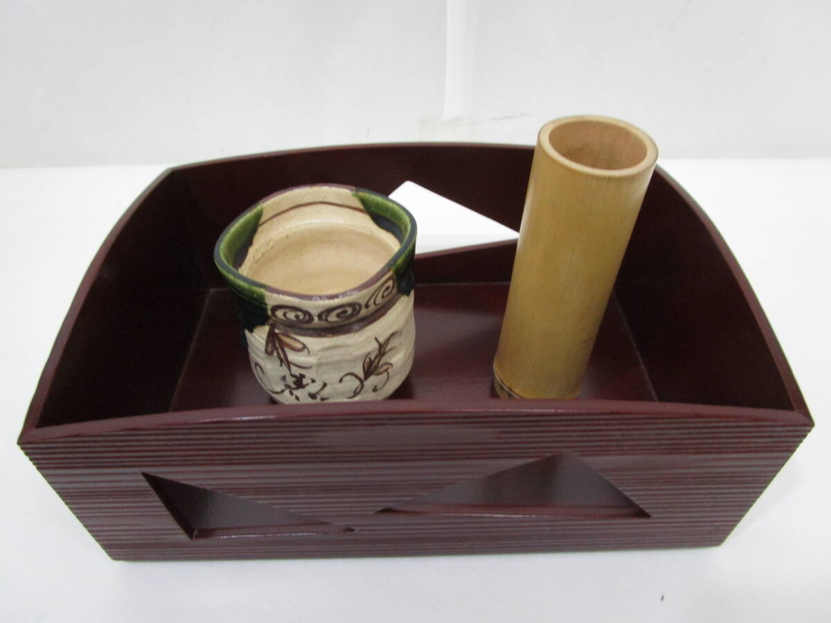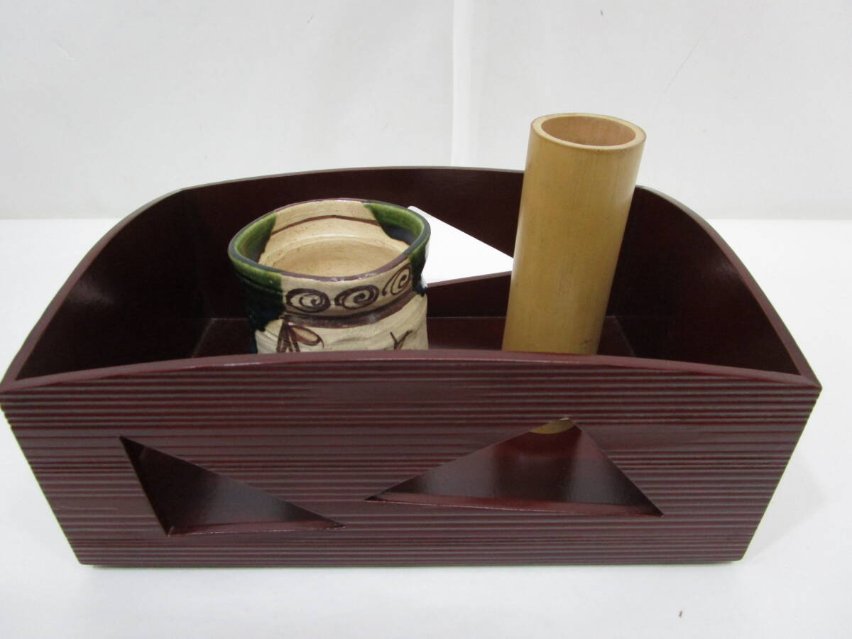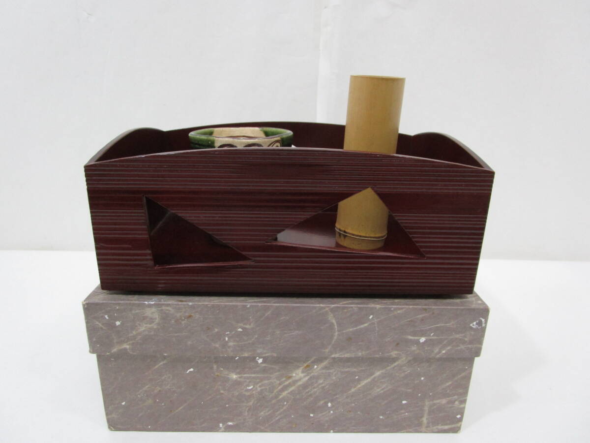 中古茶道具! 表千家 即中斎好写 一閑塗 鱗透莨盆 です。 山口錠鐵作の織部火入と竹灰吹付です。 化粧箱はヤケていますが!莨盆の状態は ★ 傷無く良好。火入は渋入仕上げです。 煙草盆のみ化粧箱(ヤケ有り)入。 どうぞ宜しく。
