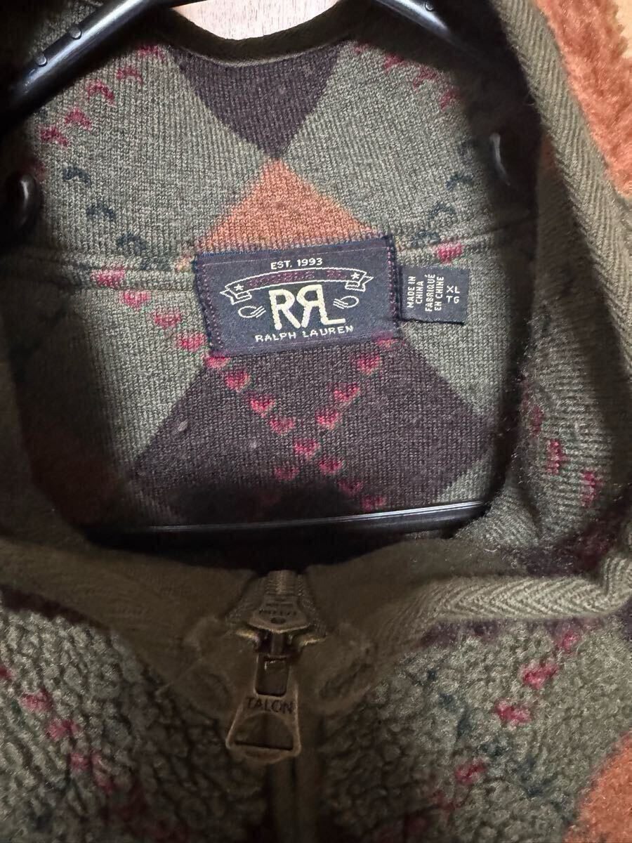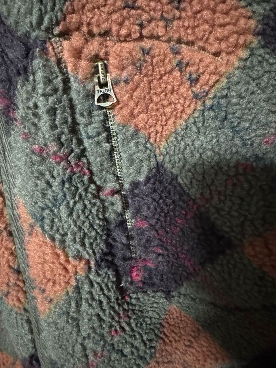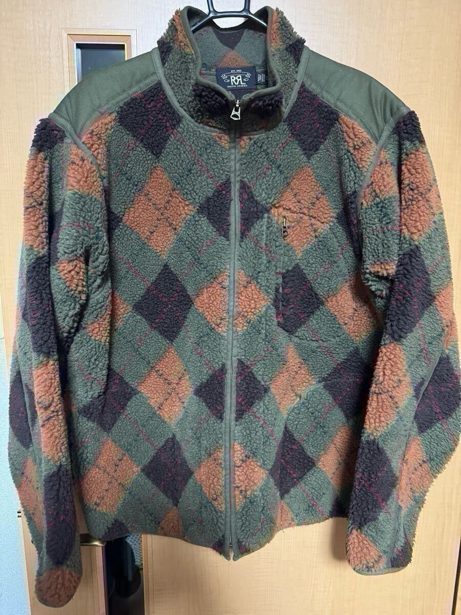 アーガイル柄に毛足の長いボア感溢れるハイパイルフリースジャケット。 フルジップ、胸元にジップポケット、ハイネック、ストレートな裾のデザイン。 バックヨークとフロント中央の表地にツイル素材の補強。 タロンジップにパイピングにもヘリンボーン地であったりとRRLらしい1着です。