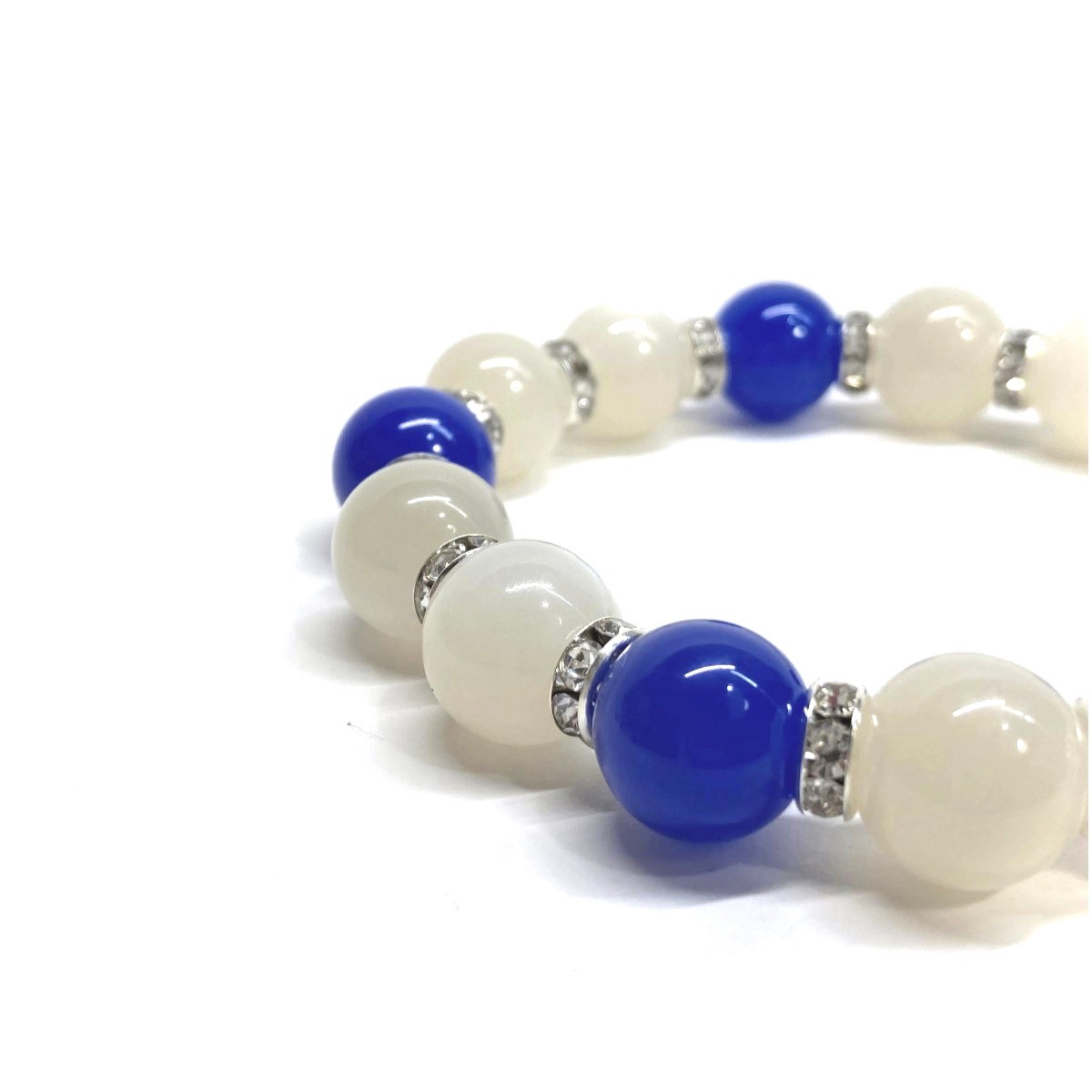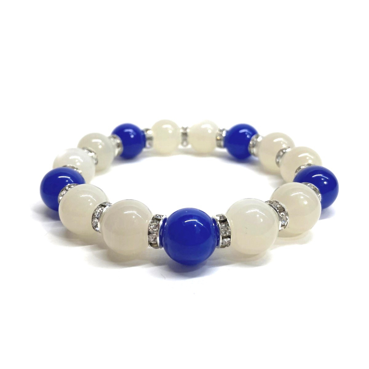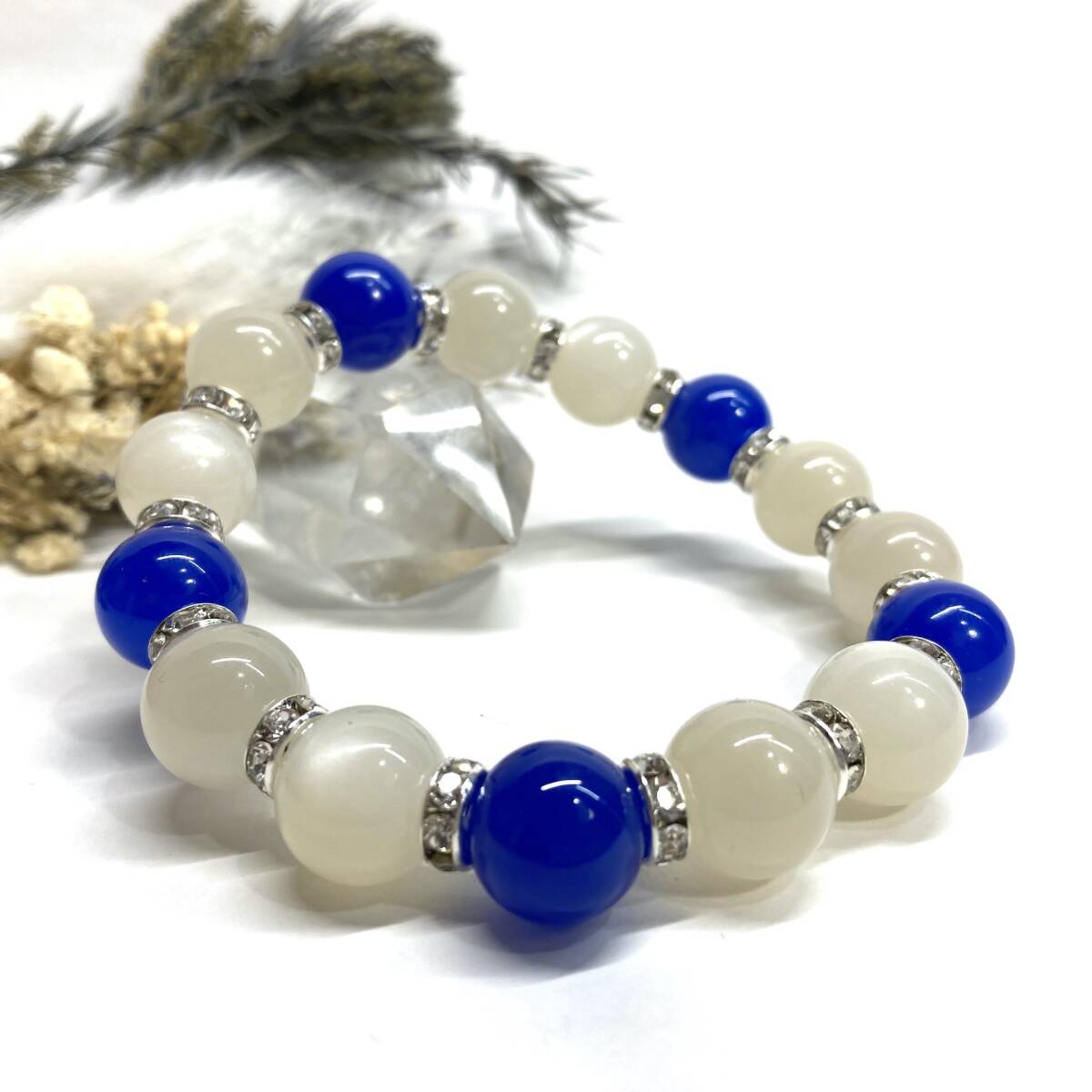 こちらは、ムーンストーンと青瑪瑙を組み合わせたパワーストーンブレスレットです。間にはロンデルを挟み高級感あるデザインに仕上げております。程よくインパクトがある12mm玉を使用して内周約18cmです。(サイズ変更の場合は取引ナビにてご連絡をお願いします。) 数に限りがございますので気になる方はお早めにどうぞ。