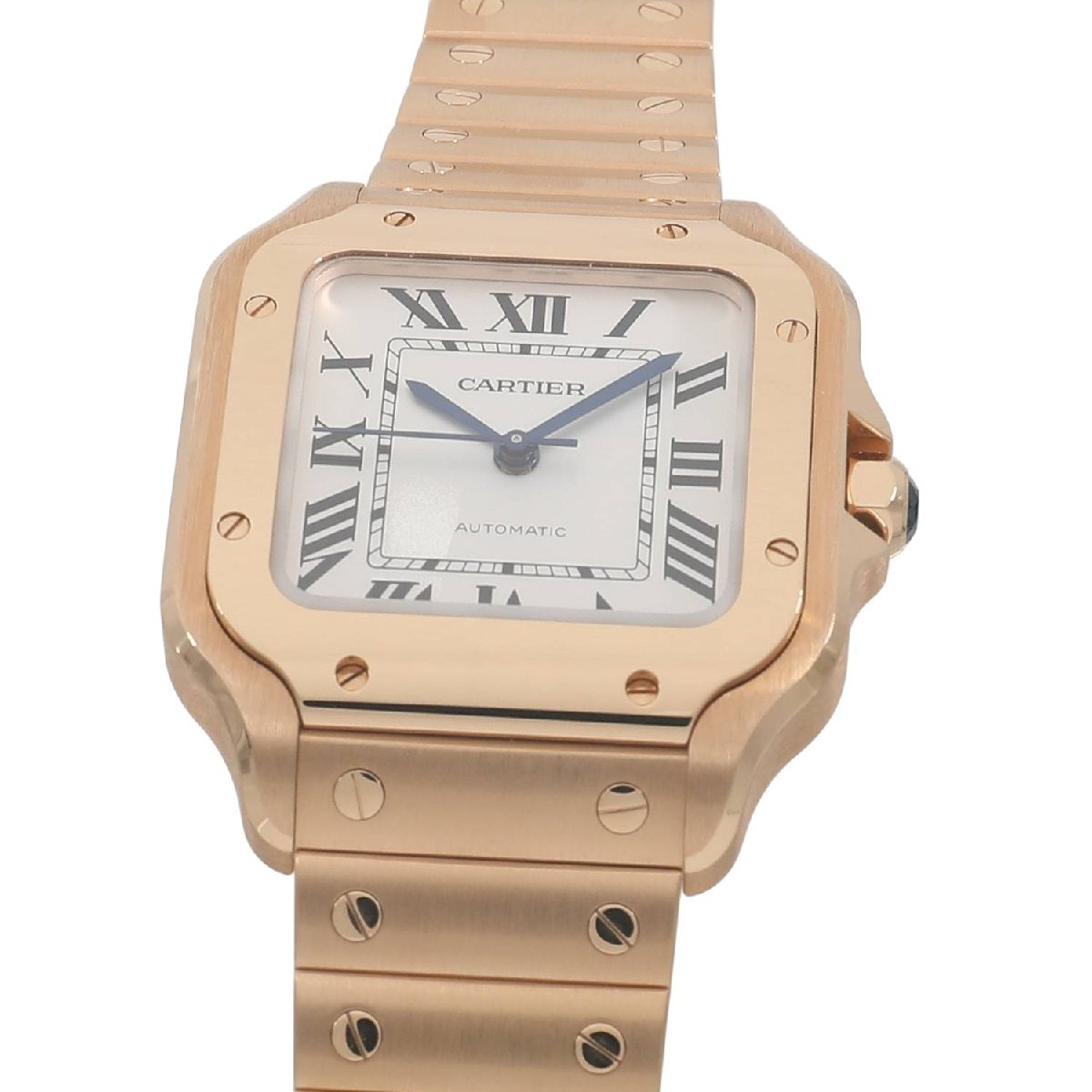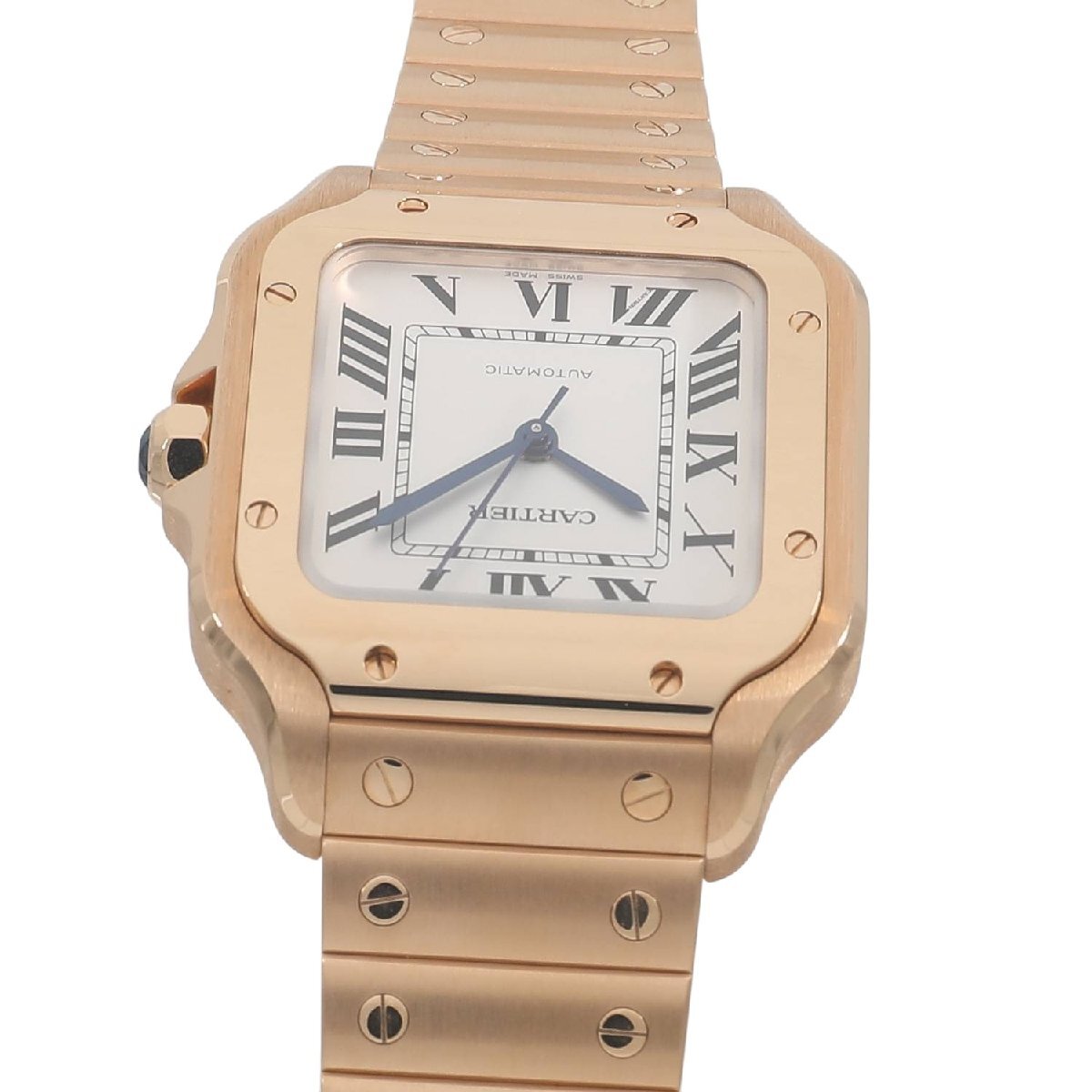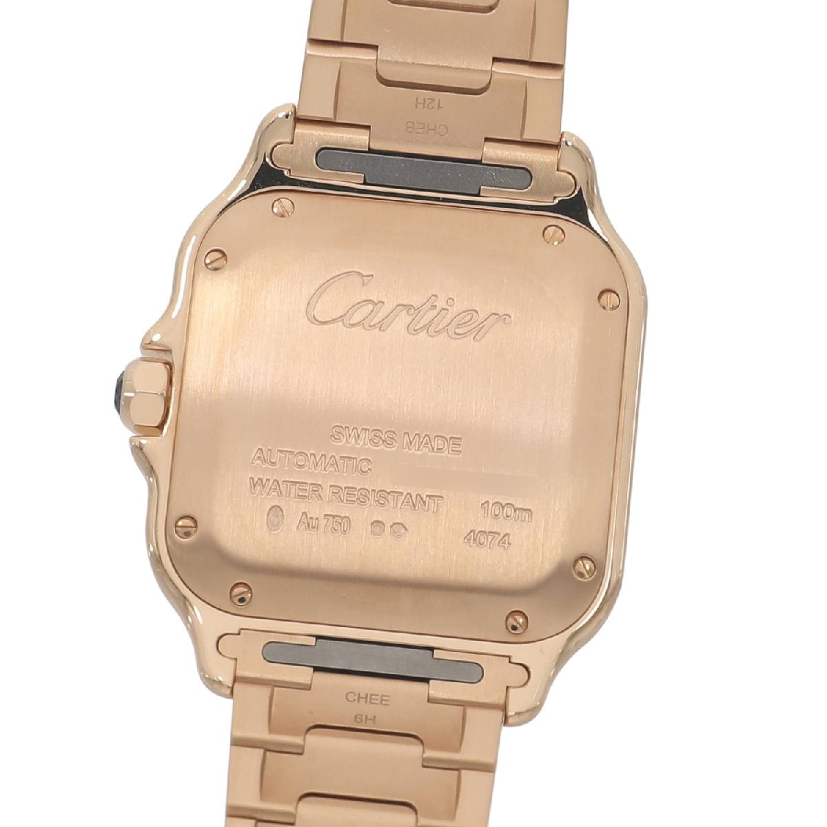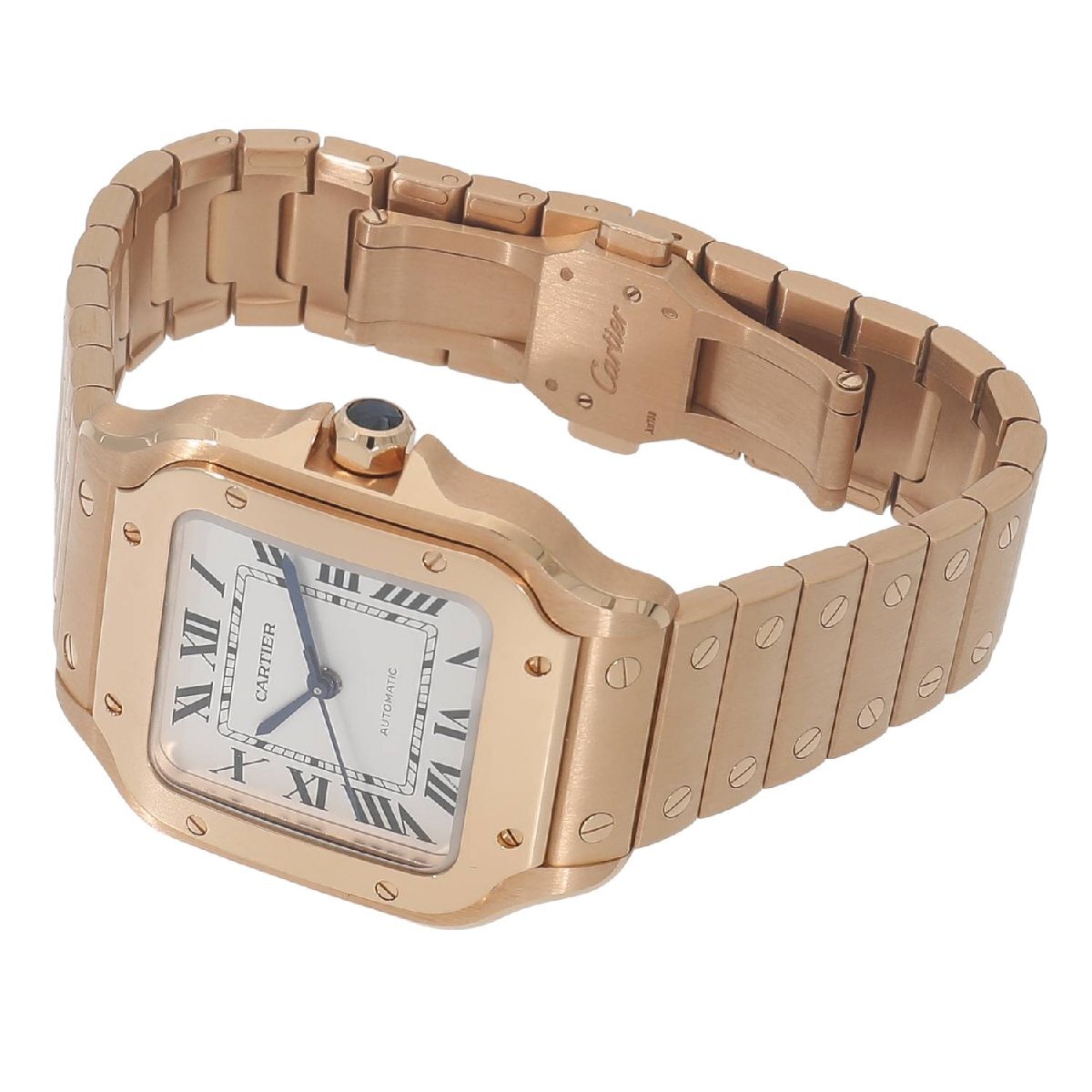 | モデルについて | カルティエの創業者であるルイ・カルティエが、友人のブラジル人飛行士であるサントス・デュモンの依頼を受け、1904年に生み出したカルティエのアイコニックピースである”サントス・ウォッチ”。自社キャリバー1847MCを搭載し、2018年に新型のサントスが発表されます。最新のサントスの見た目はそのままに、ケースからブレスレットに至るまでピンクゴールドで統一されエレガント且つラグジュアリーな印象を放ちます。ブレスレットは簡単に着脱ができるクイックスイッチにより、シーンや気分によって付属のレザーストラップに交換が可能です。またブレスレットのサイズ調整もスマートリンク調整システムにより、容易にコマの着け外しが可能になりました。MMサイズは女性でもご使用いただけるサイズ感です。 |