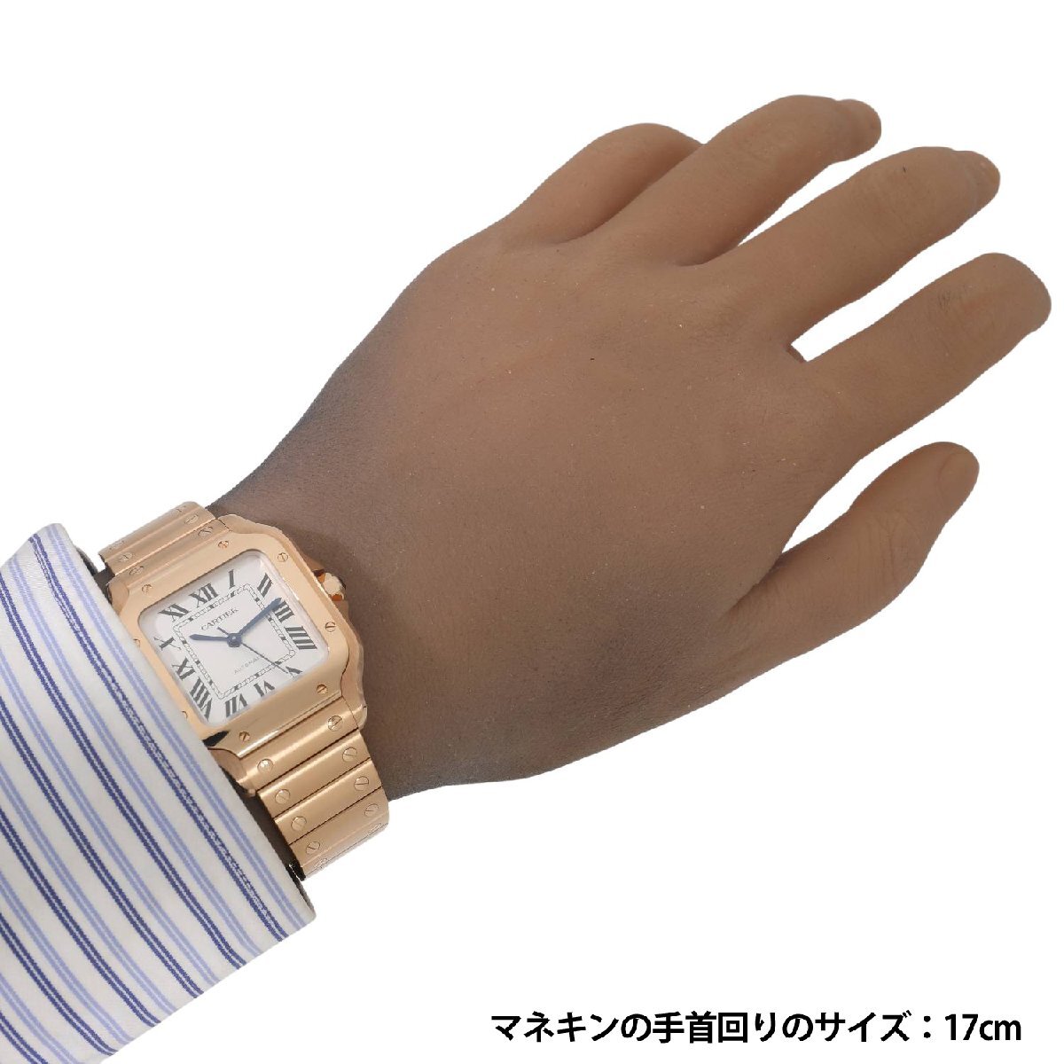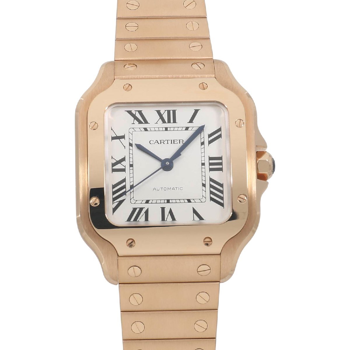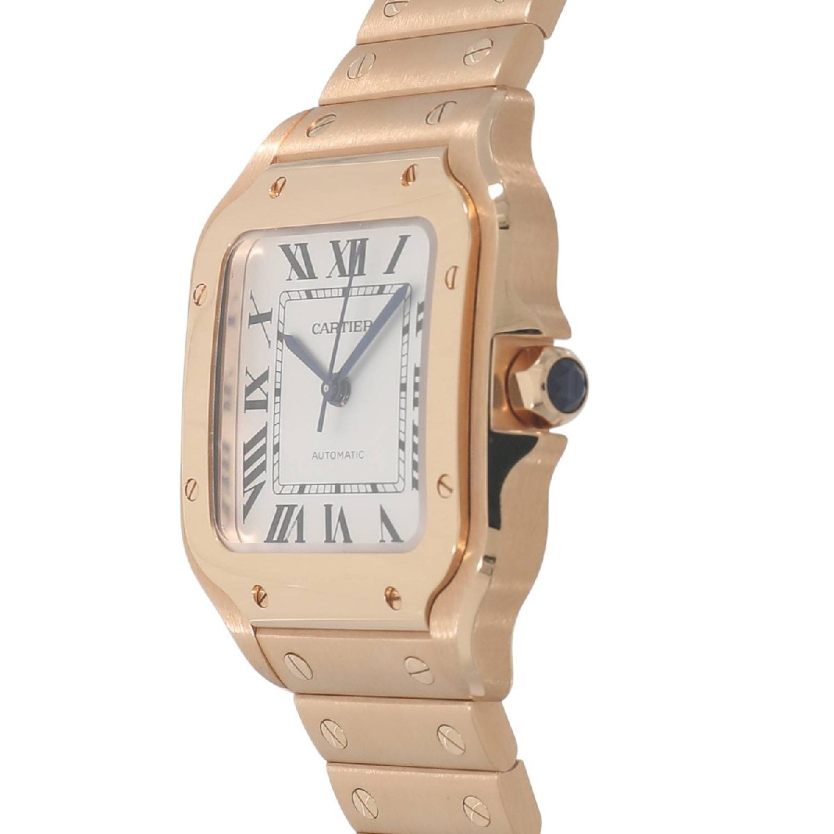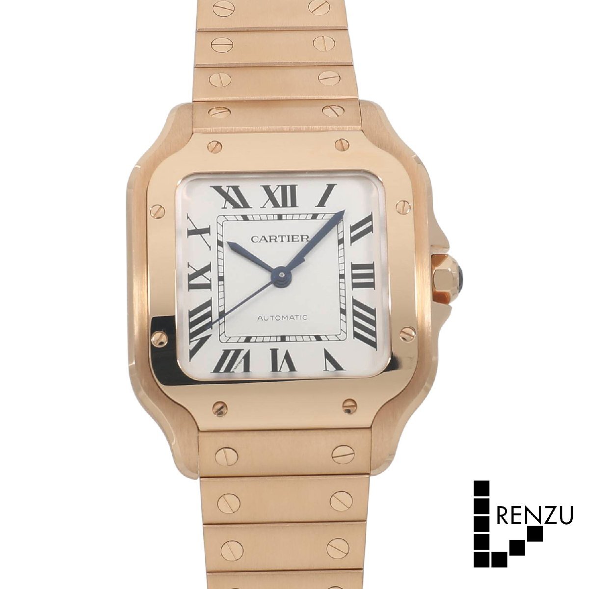 | モデルについて | カルティエの創業者であるルイ・カルティエが、友人のブラジル人飛行士であるサントス・デュモンの依頼を受け、1904年に生み出したカルティエのアイコニックピースである”サントス・ウォッチ”。自社キャリバー1847MCを搭載し、2018年に新型のサントスが発表されます。最新のサントスの見た目はそのままに、ケースからブレスレットに至るまでピンクゴールドで統一されエレガント且つラグジュアリーな印象を放ちます。ブレスレットは簡単に着脱ができるクイックスイッチにより、シーンや気分によって付属のレザーストラップに交換が可能です。またブレスレットのサイズ調整もスマートリンク調整システムにより、容易にコマの着け外しが可能になりました。MMサイズは女性でもご使用いただけるサイズ感です。 |