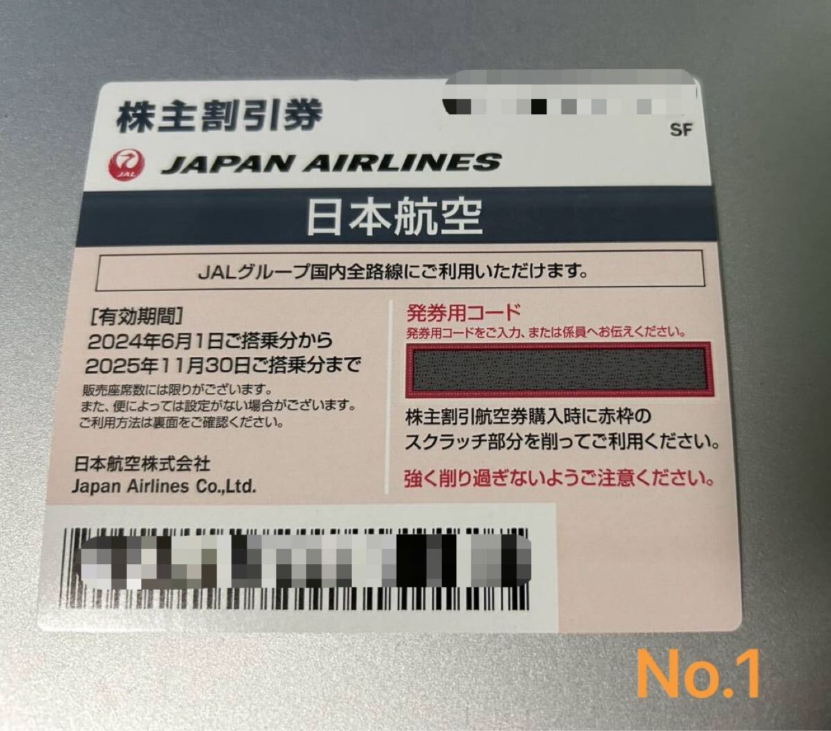 JAL(日本航空)の株主優待券です。 個数:1枚 有効期限:2025年11月30日