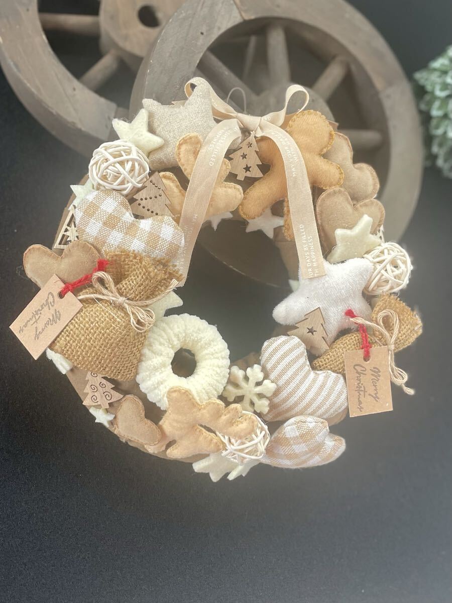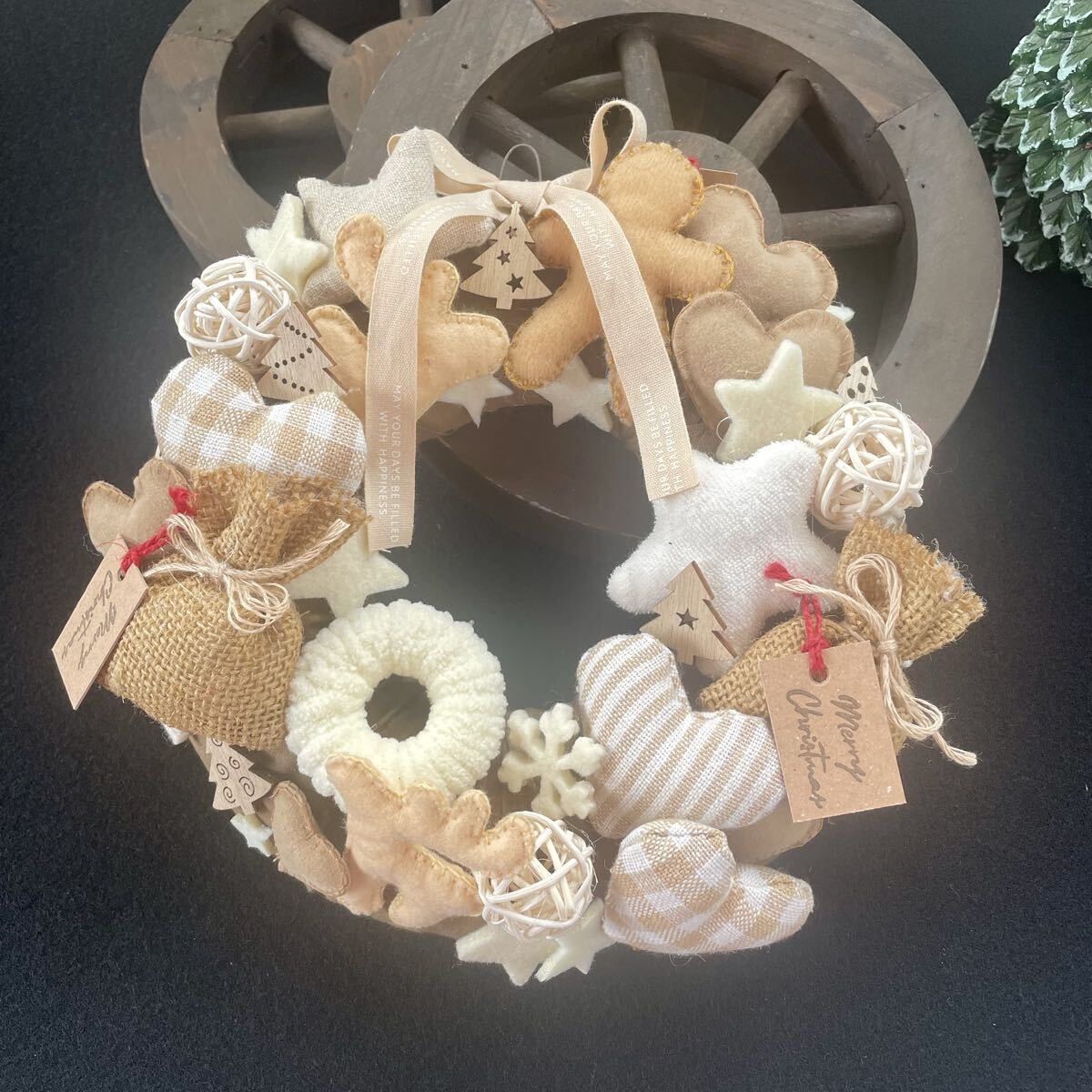 フェルトや布で作ったハート、トナカイ、プレゼント、ジンジャークッキー、リース等で作った、ベージュ系のクリスマスリースです。