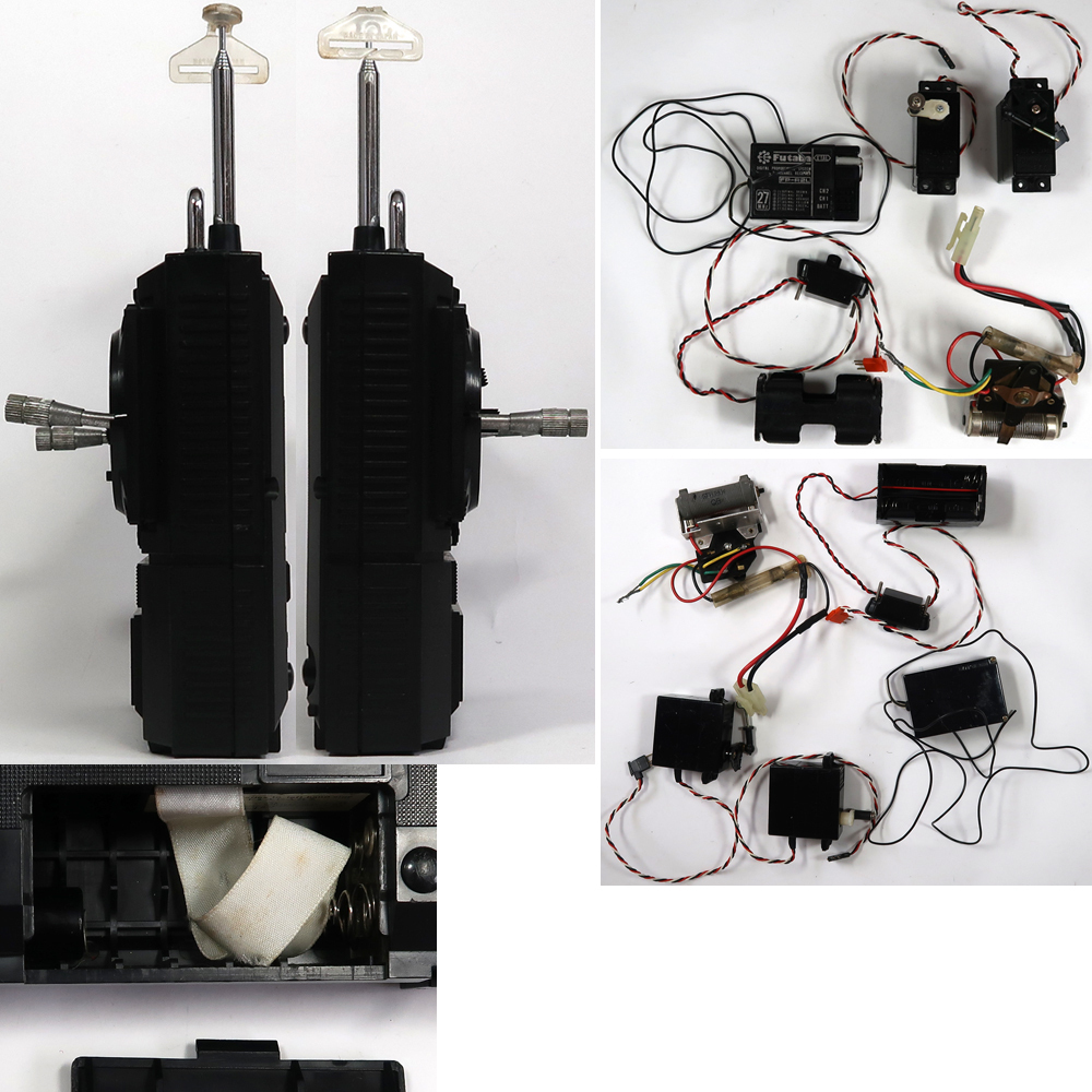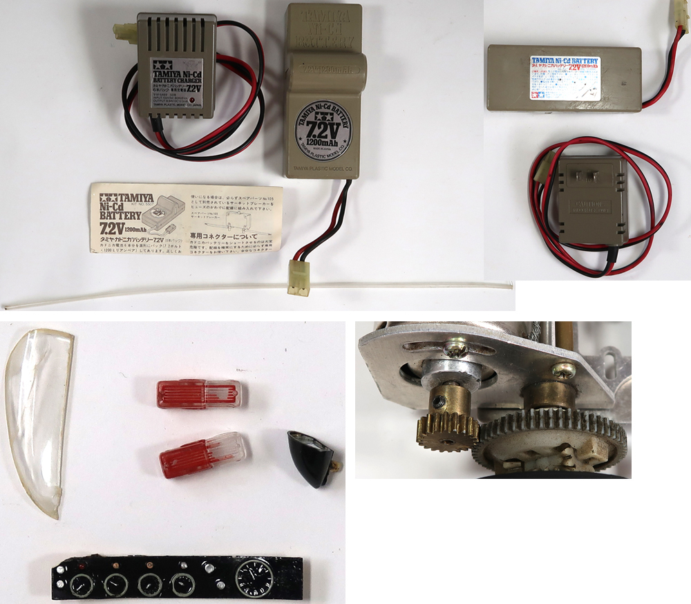 出品は画像の物のみです。他に必要なものはご自分でご用意ください。当時ものの7.2Vのバッテリーは使用可能ですが、消耗品ですのでいかなる状態であったとしてもノークレームです。バッテリーが不要な方がいましたら落札後にお伝え下さい。出品前にある程度のクリーニングはしております。使用品ですので所々に擦り傷や汚れが有ります。タイヤは劣化していますので実際に外での走行などをした場合は破損する可能性がありますので、展示のみようにされた方がいいです。ボディーは右フロントライトが破損しております。破損したパーツはありますがヒビが入っています。コックピット内のスピードメーターとバックミラー、右サイドミラーとリアのストップランプが取れています。シャーシについているボディー留めの部分の両片方が折れてなくなっています。引っ掛ける部分は問題ないので、ボディはきちんと留められます。私が確認する限りはその他にひどい破損は確認出来ませんでした。画像をご覧のように受信機用電池ケース、サーボや受信機は取り付けられておりません。プロポのステアリンスティックが曲がっています。電池を入れてプロポとサーボの動作確認をしましたが動作はしました。完璧に動作させるためには必要なパーツを用意して、さらなるメンテナンスは必要かと思います。分かる事は以上です。お取引後は一切のサポートはしておりません。また必要なパーツはお取り引き後にご自分でお調べください。お取り引き後に説明以外の不足品や説明以外の破損や故障が有ったとしても返品は出来ませんしクレームもお受けできません。