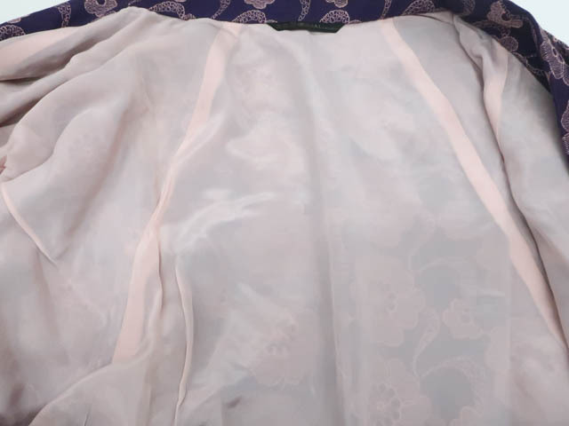 リサイクル商品のため、裏地に穴あきがございますが着用可能なお品です。 地色は、紫色です。 1枚目の画像が近いお色かと思われます。 素材は化繊です。 |