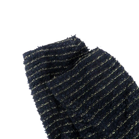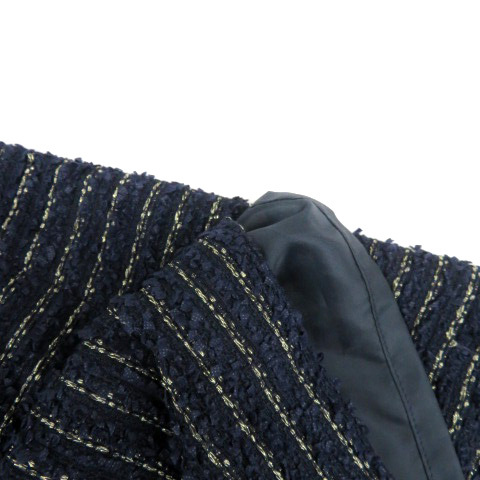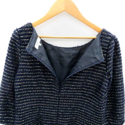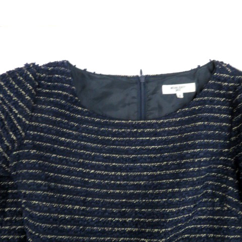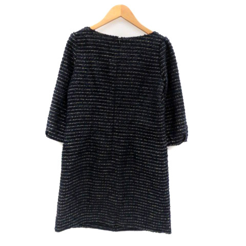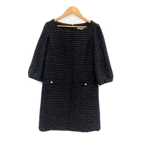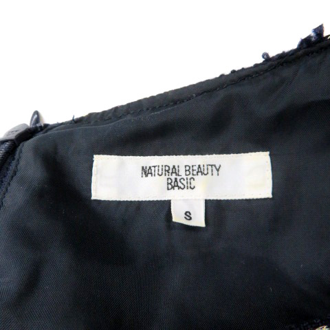 ナチュラルビューティーベーシック ワンピース ラウンドネック 五分袖 ミニ丈 ツイード S 紺 ネイビー ゴールド色 レディース