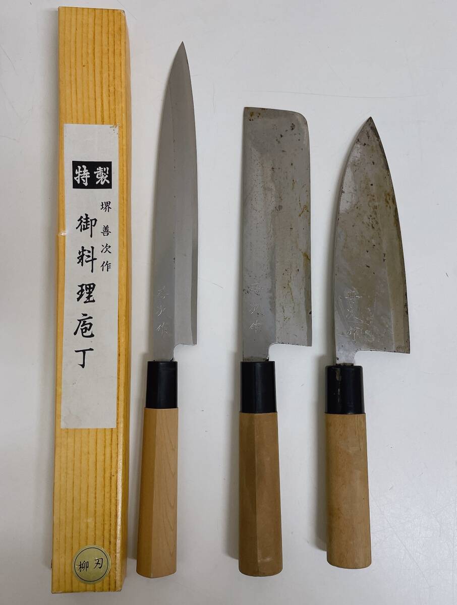 ☆【料理用包丁 堺善次 作 包丁 3点 まとめて】調理器具 /刃物 /出刃包丁 /刺身包丁 /菜切り包丁 /和包丁 /A79-305