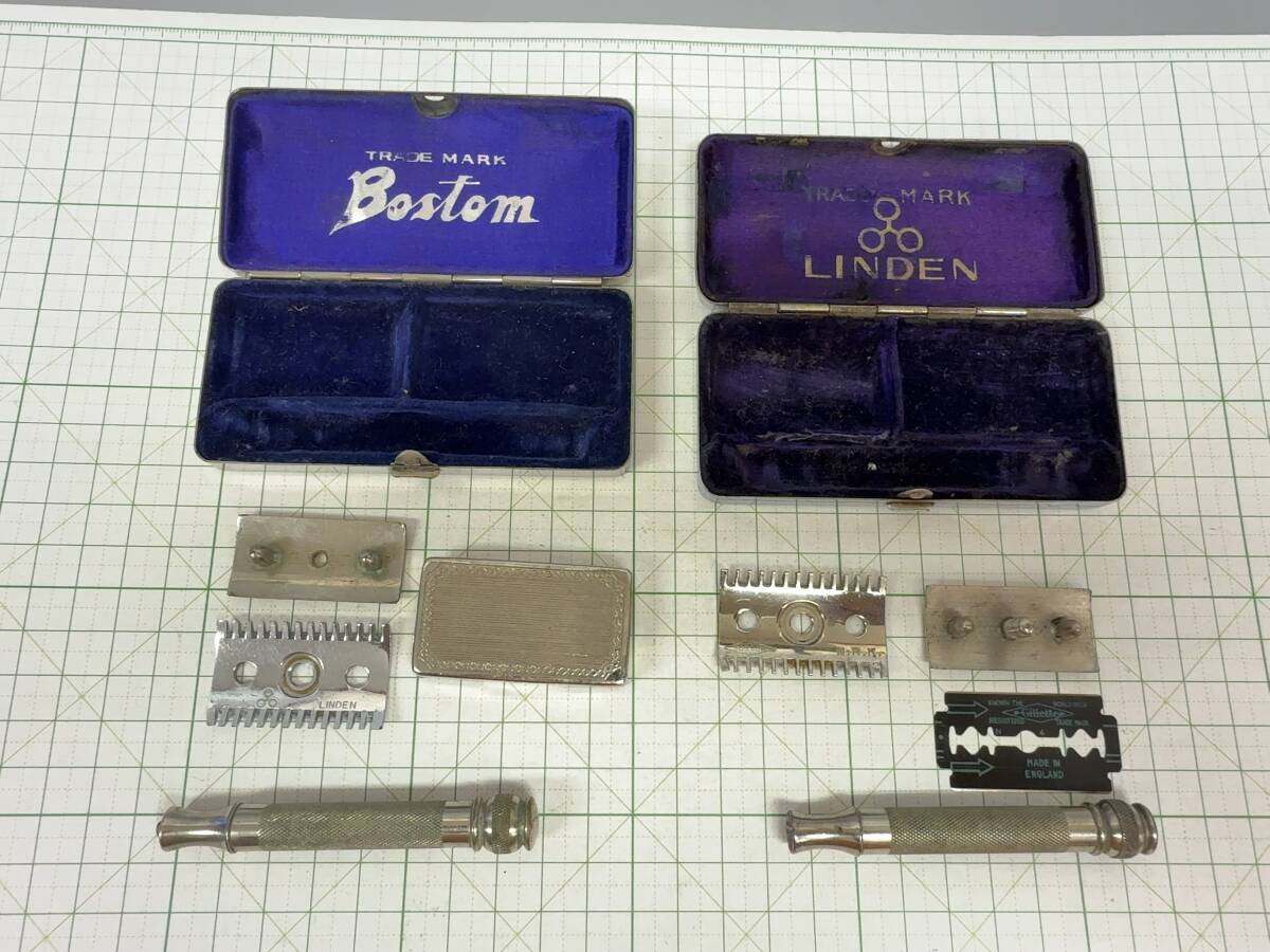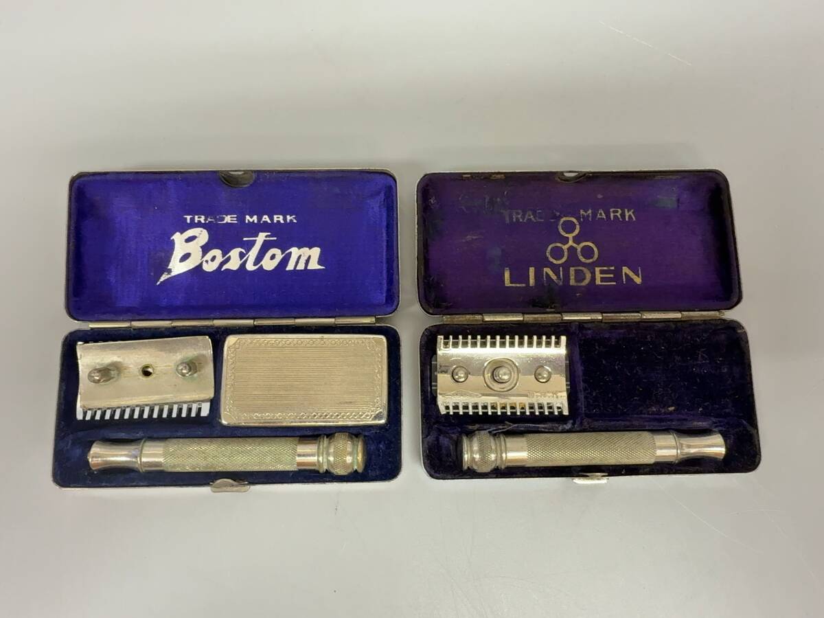 ビンテージ 安全カミソリ 2点まとめて ケース付き Boston / Linden 髭剃り 剃刀 レトロ 昭和レトロ 英国製替刃付き【1003k-8】