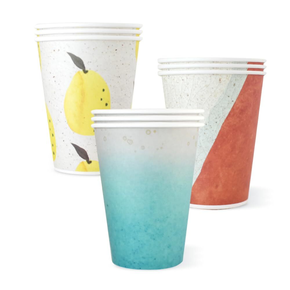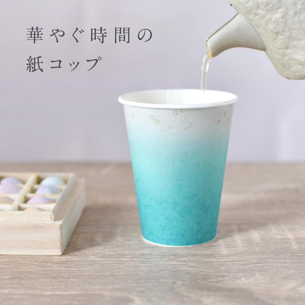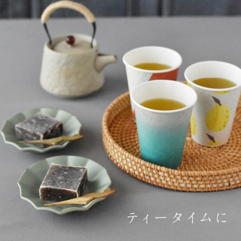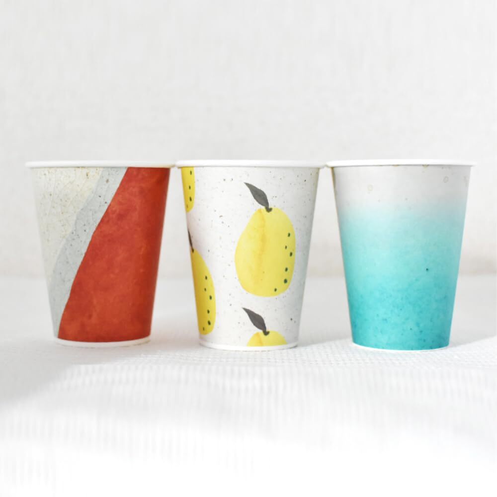 【和風デザインの紙コップでおしゃれなテーブルを演出♪】水色、柚子柄、茶水色の色目の焼き物のようなデザイン。ほっとしたい瞬間や大人のパーティが華やかに。