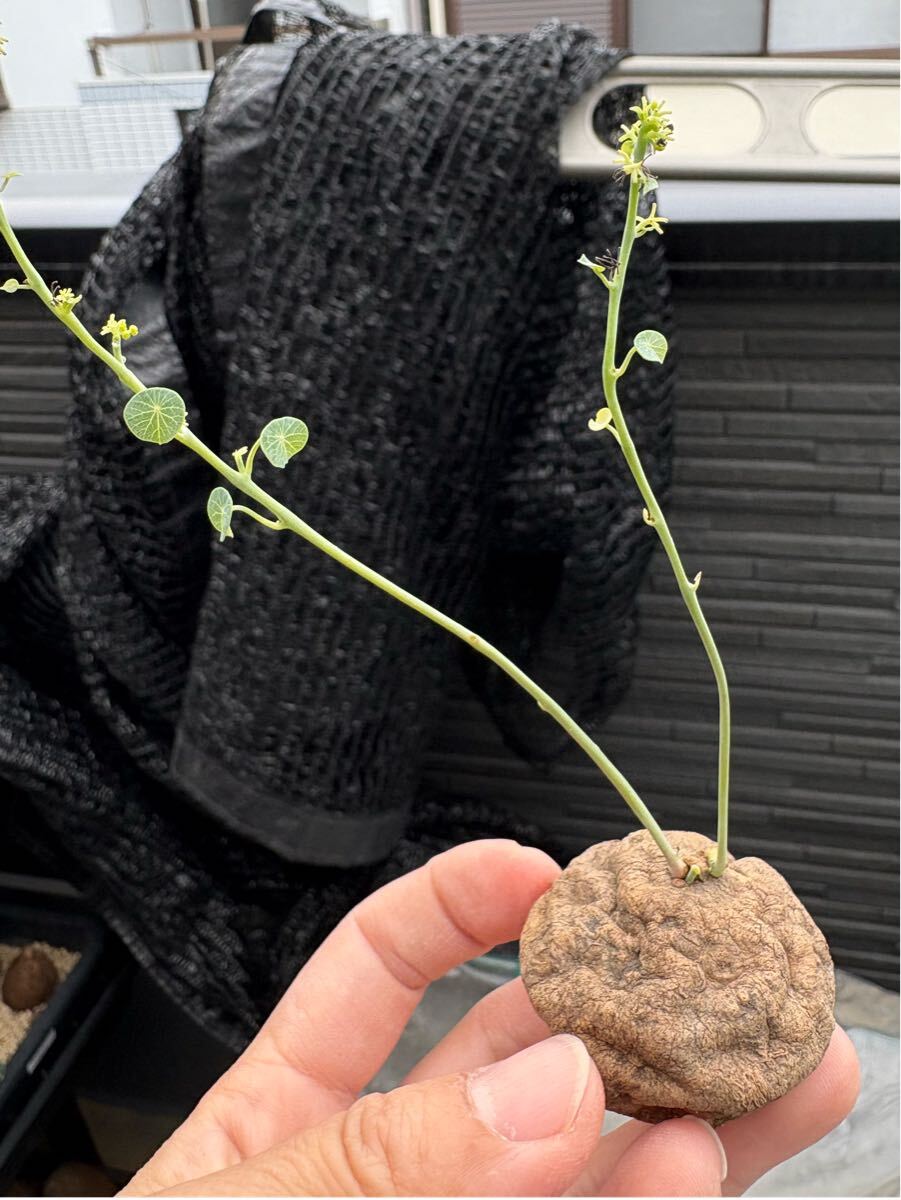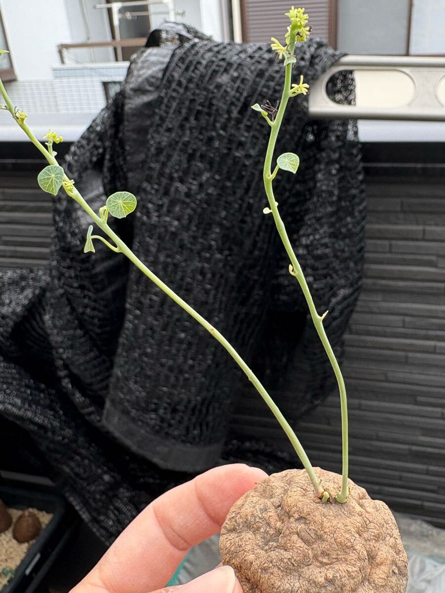 まるで芋様な塊根が特徴のステファニア。 暖かくなるとツルがひょろひょろっと長く伸びてその先に葉が開きます。