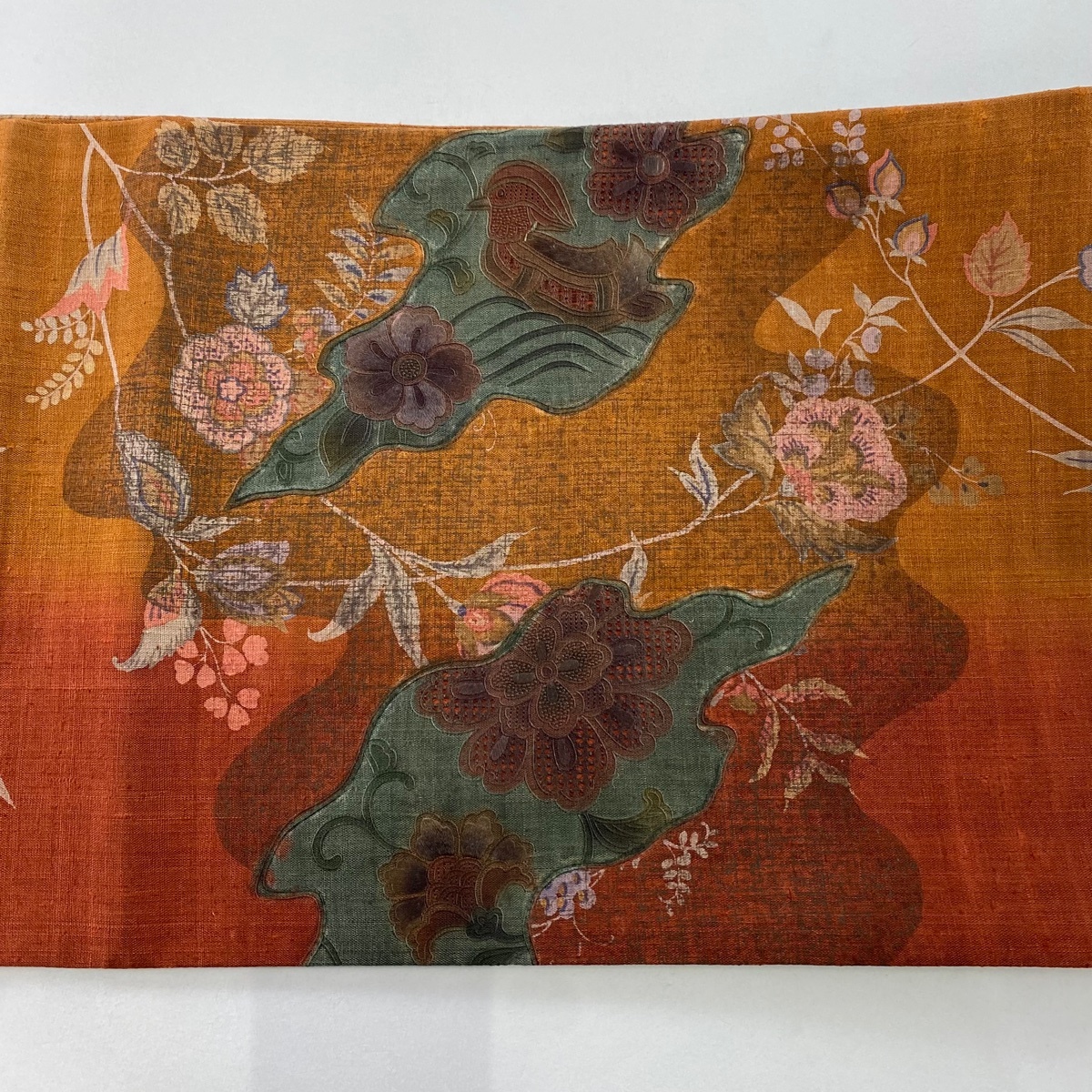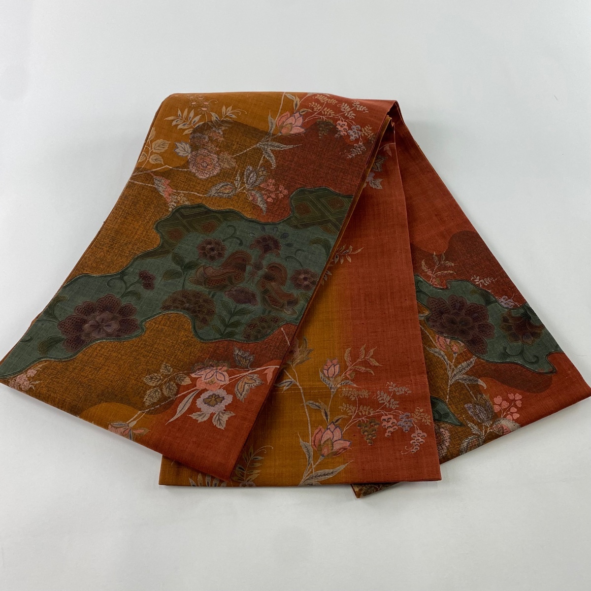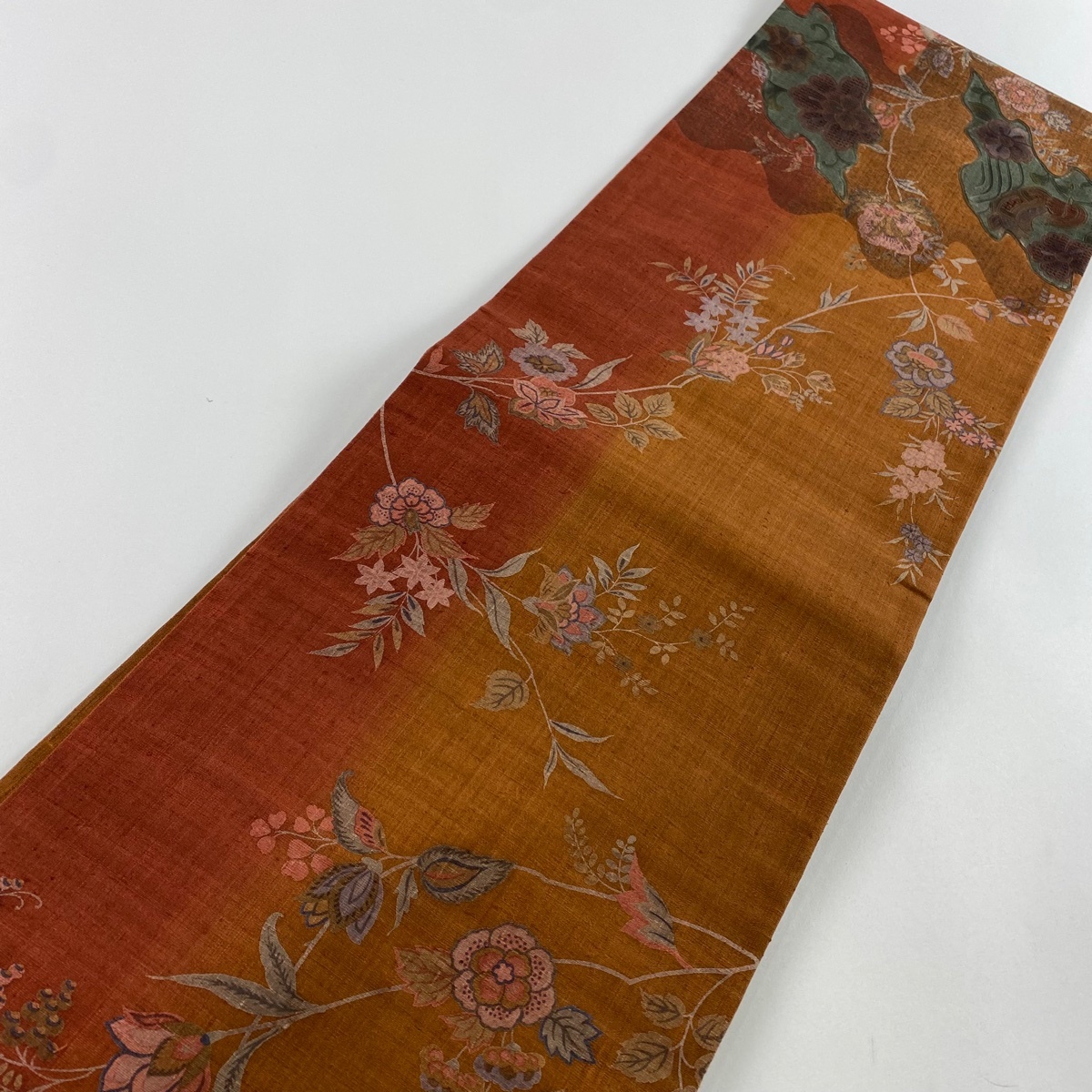 | 袋帯 美品 秀品 紬地 花唐草 向かい鳥 刺繍 ぼかし 赤茶 お太鼓柄 正絹 【中古】 |