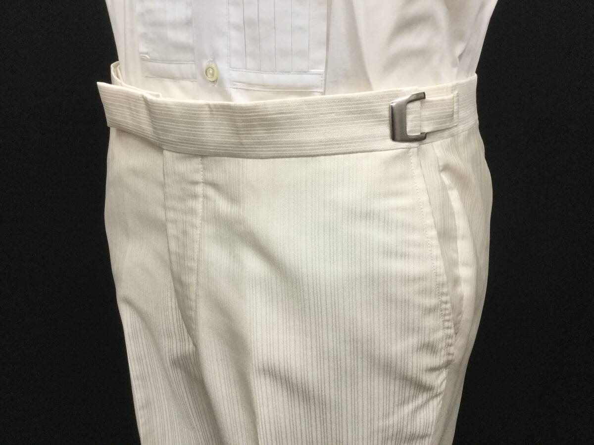 上衣と同生地のパンツはスッキリとしたノータック、アジャスター付きでサイズ調節可