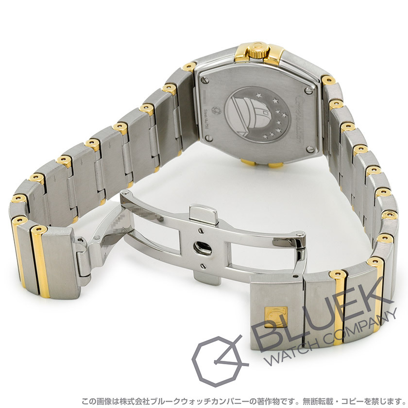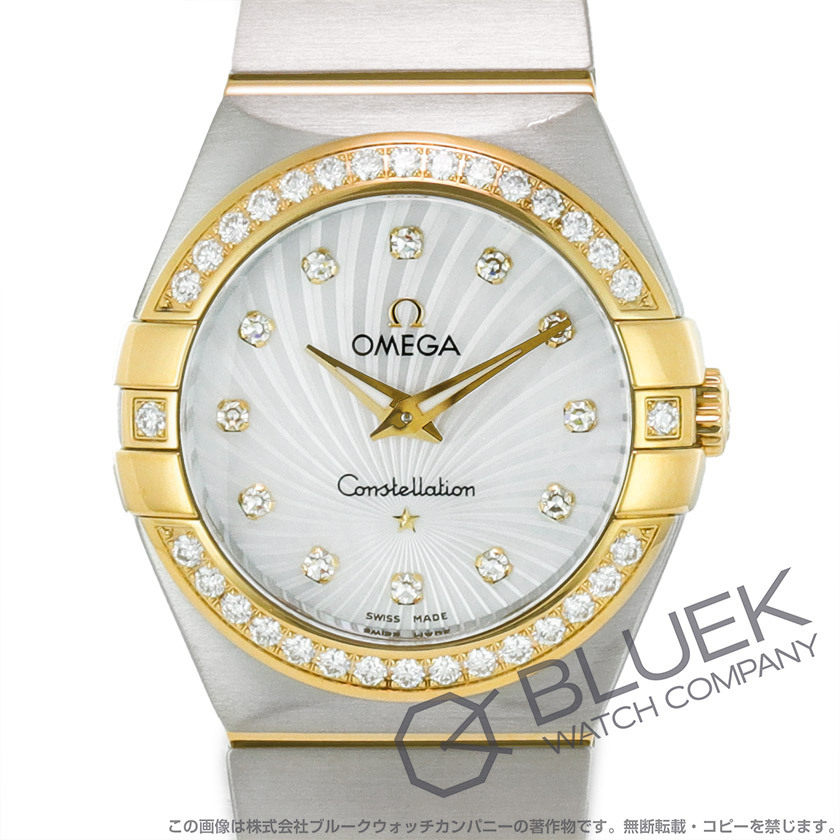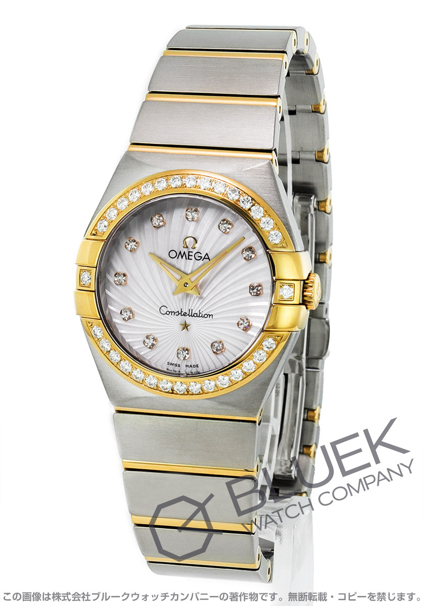 | 柔らかな光沢のホワイトシェルダイヤルに華麗なスーパーノヴァ模様と12粒のダイヤモンドが装飾された、非常に豪華な27ミリのオメガコンステレーションです。さらに金無垢ゴールドベゼルにセッティングされたダイヤモンドがラグジュアリーな煌めきを放ち、ダイヤルの美しさをいっそう引き立てています。金無垢ゴールドがスマートに組み込まれたコンビブレスがブラッシュ仕上げになっていることも、この時計の魅力ポイント。ケースとブレスのツヤを抑えることで、華やかな表情の中にも落ち着きのある上品な手元をつくります。 |