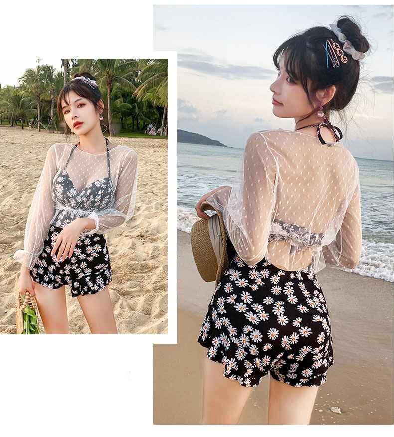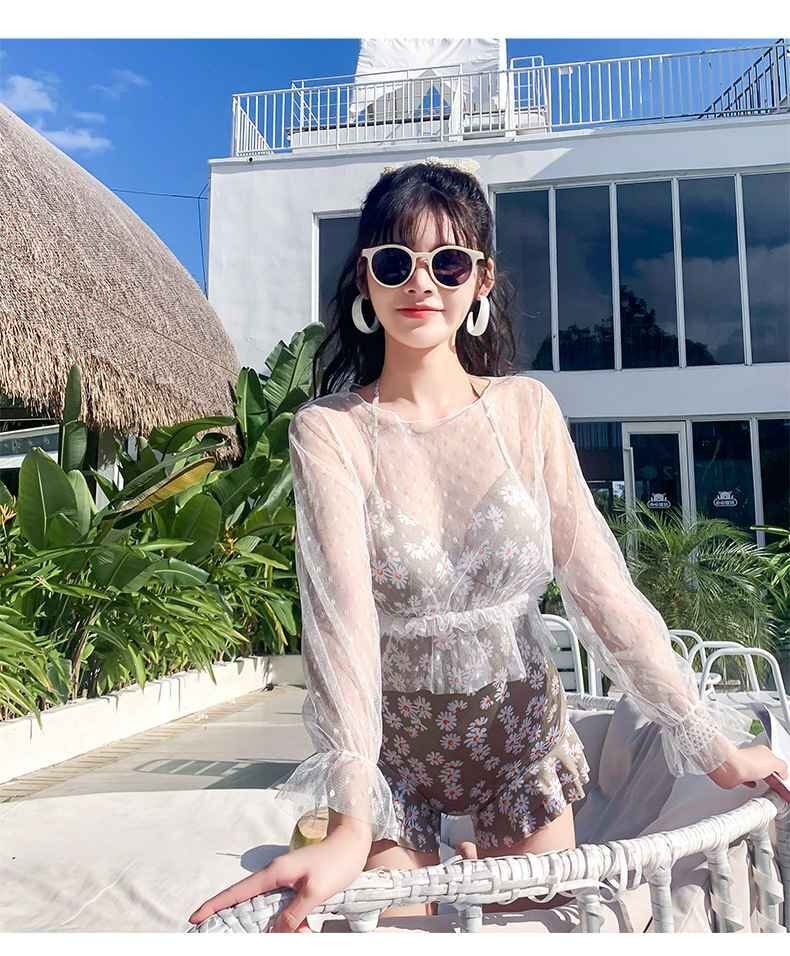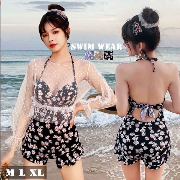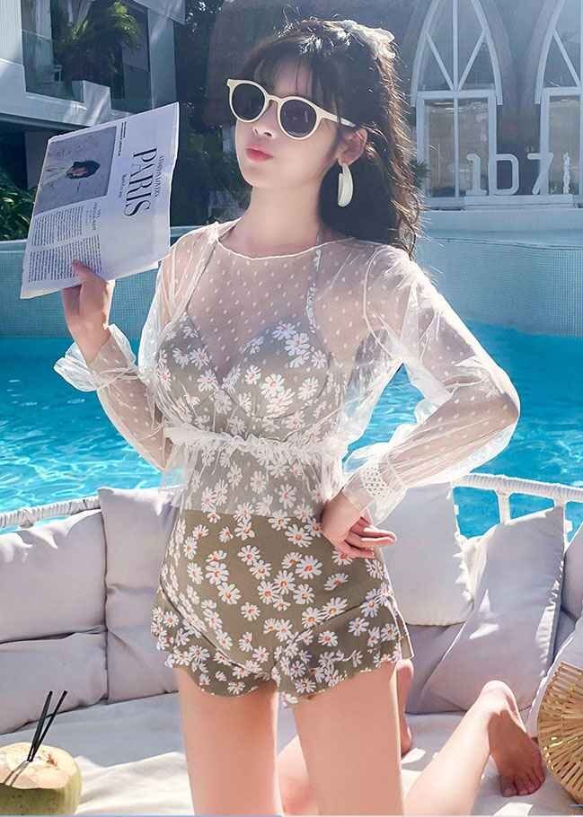 ・裾フリルが効いた上品な花柄のワンピース水着。露出は控えめです。
